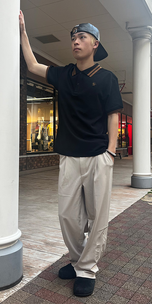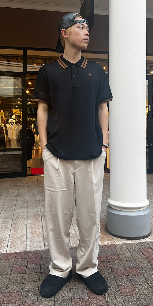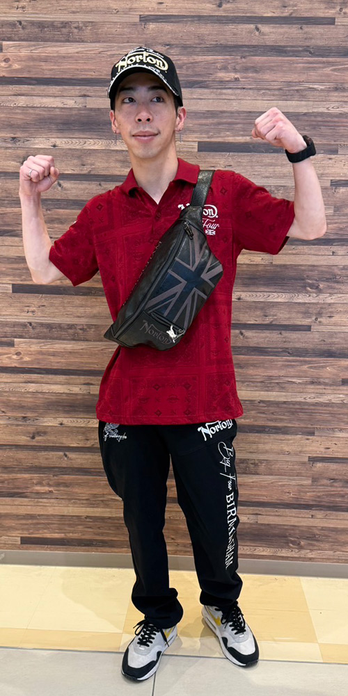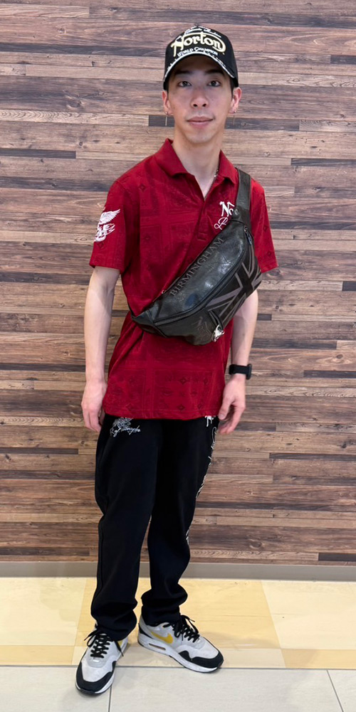 夏の始めとあり、気合を入れて、バンダナ柄の赤色のポロシャツをチョイス♪パンツは、ブラックパンツを合わせて大人コーデを演出!!CAP・ボディバッグはNORTONらしい大人カッコいい刺繍が入ったアイテムを