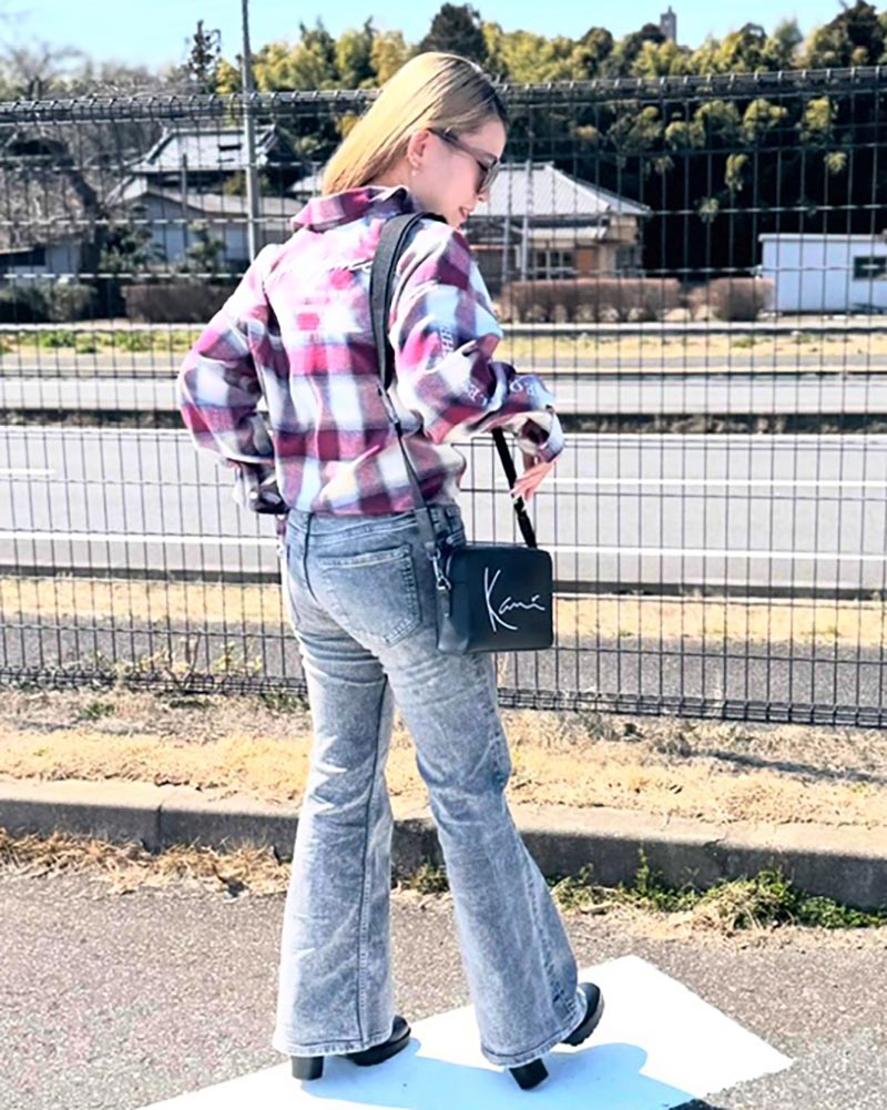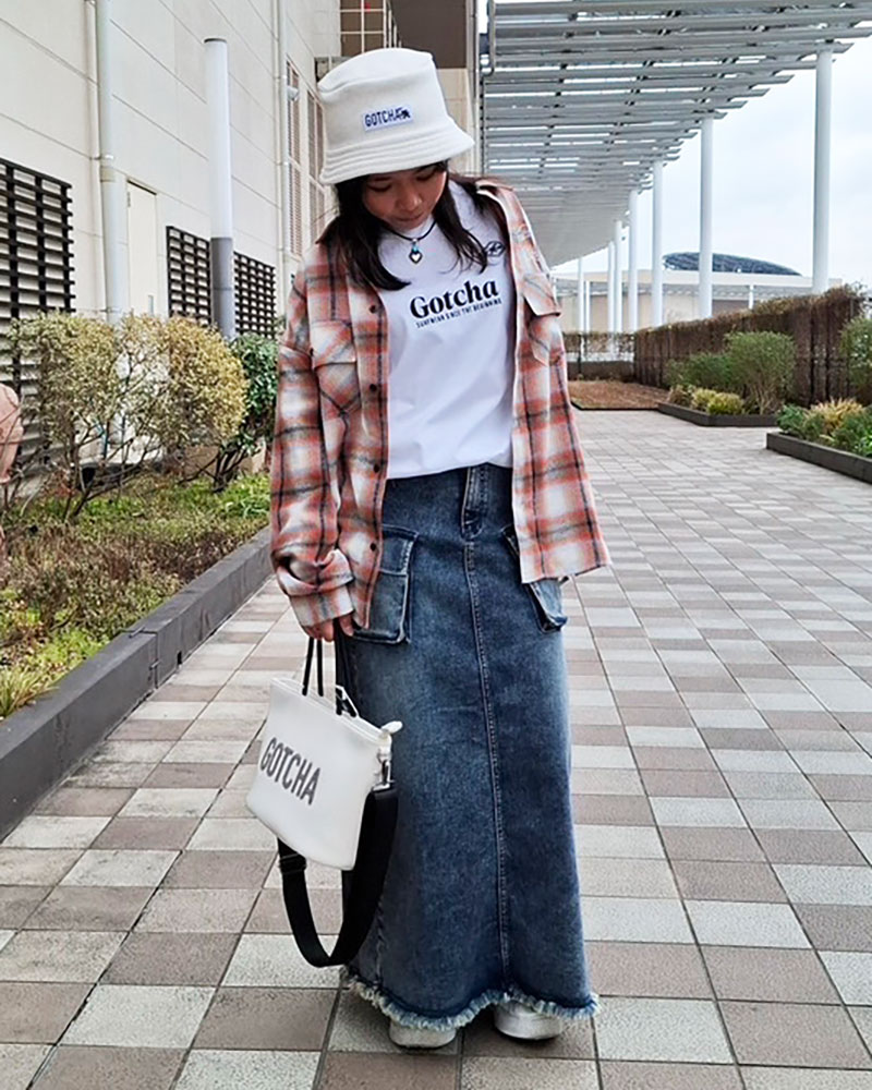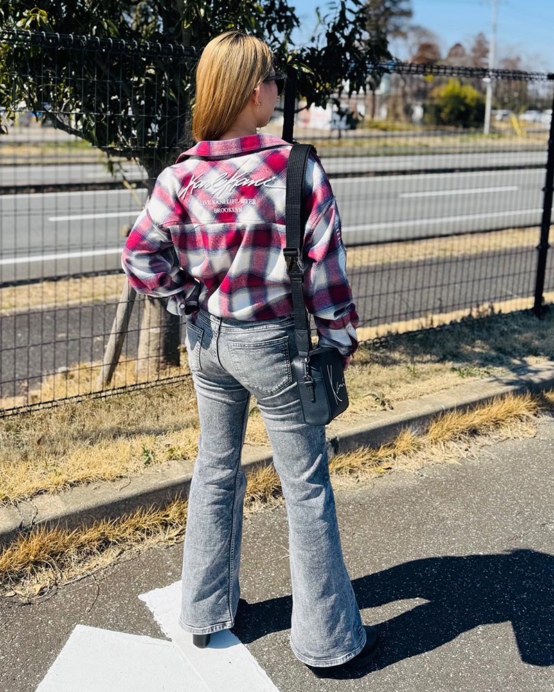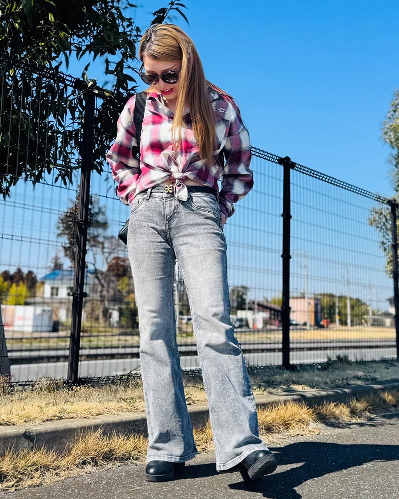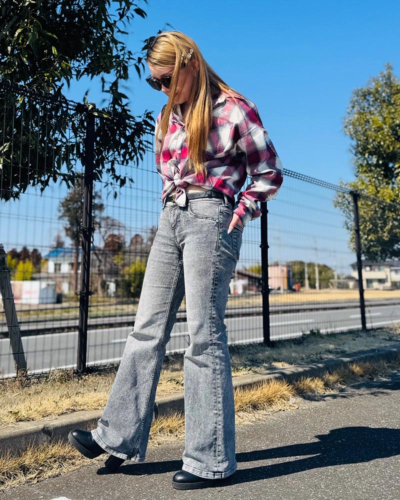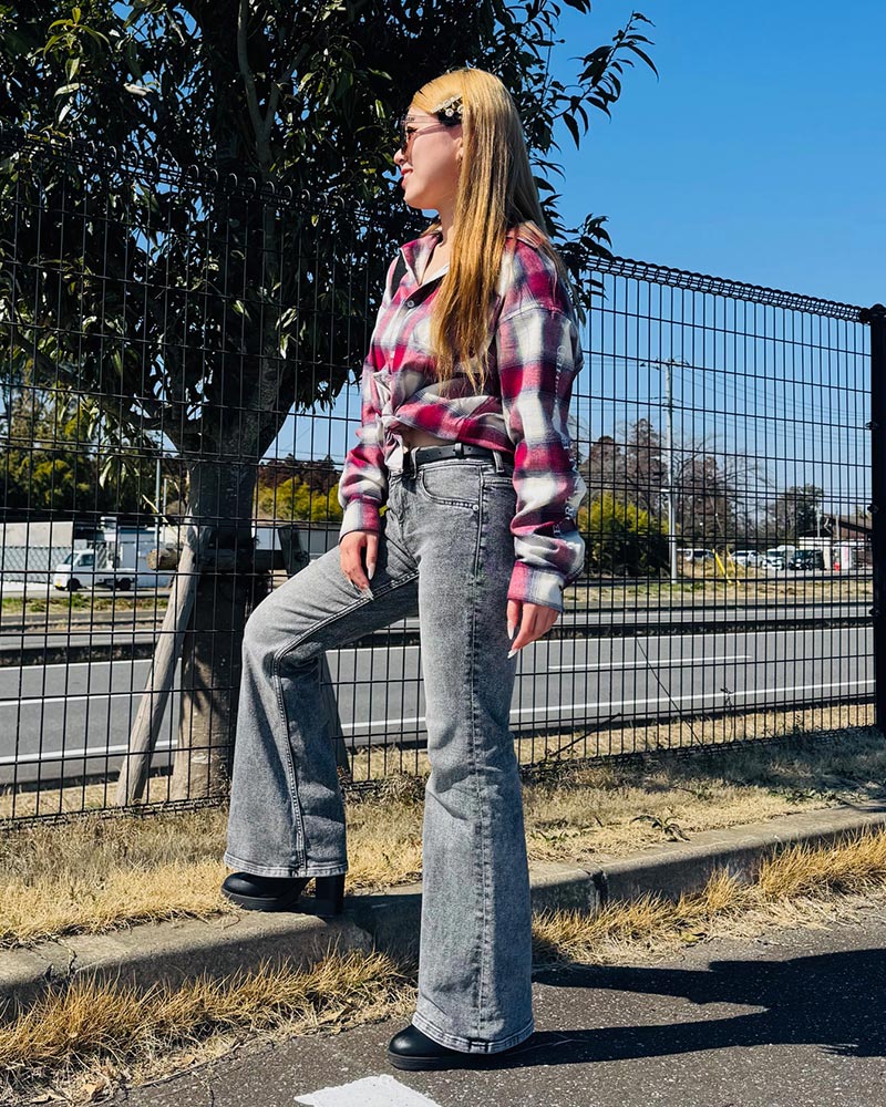赤のチェックシャツをおへそのあたりでちょっと結んでるのがすごく可愛い!カジュアルだけど、ちょっと遊び心もあっておしゃれ感がアップしてる感じ。スタイリッシュな長ズボンが全体を引き締めて、すごくバランスよくまとまってるよ。シンプルだけど、ちょっとしたディテールでおしゃれが光るコーデだね。