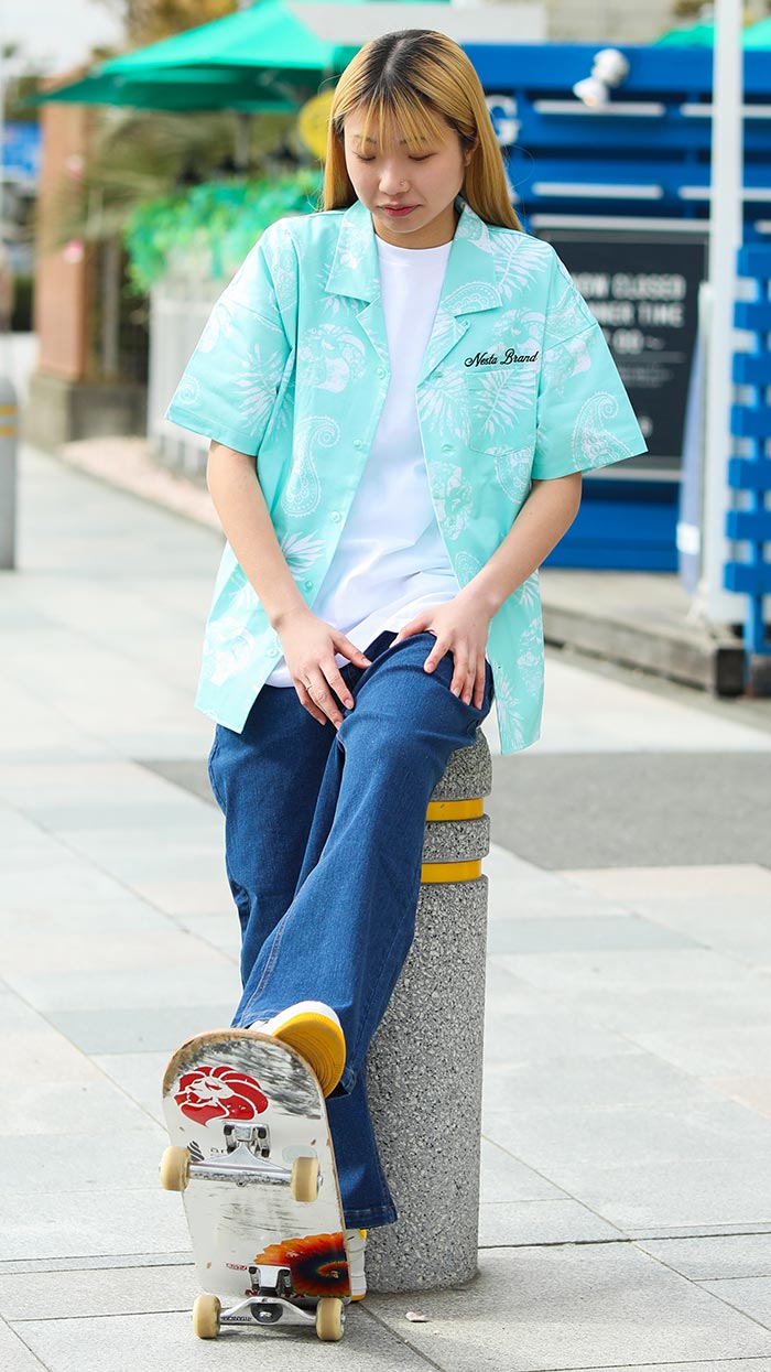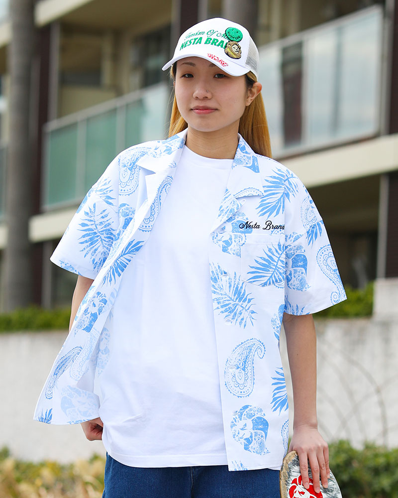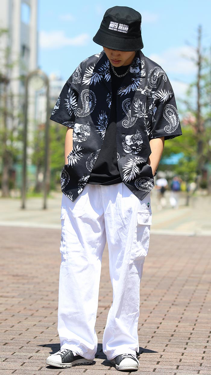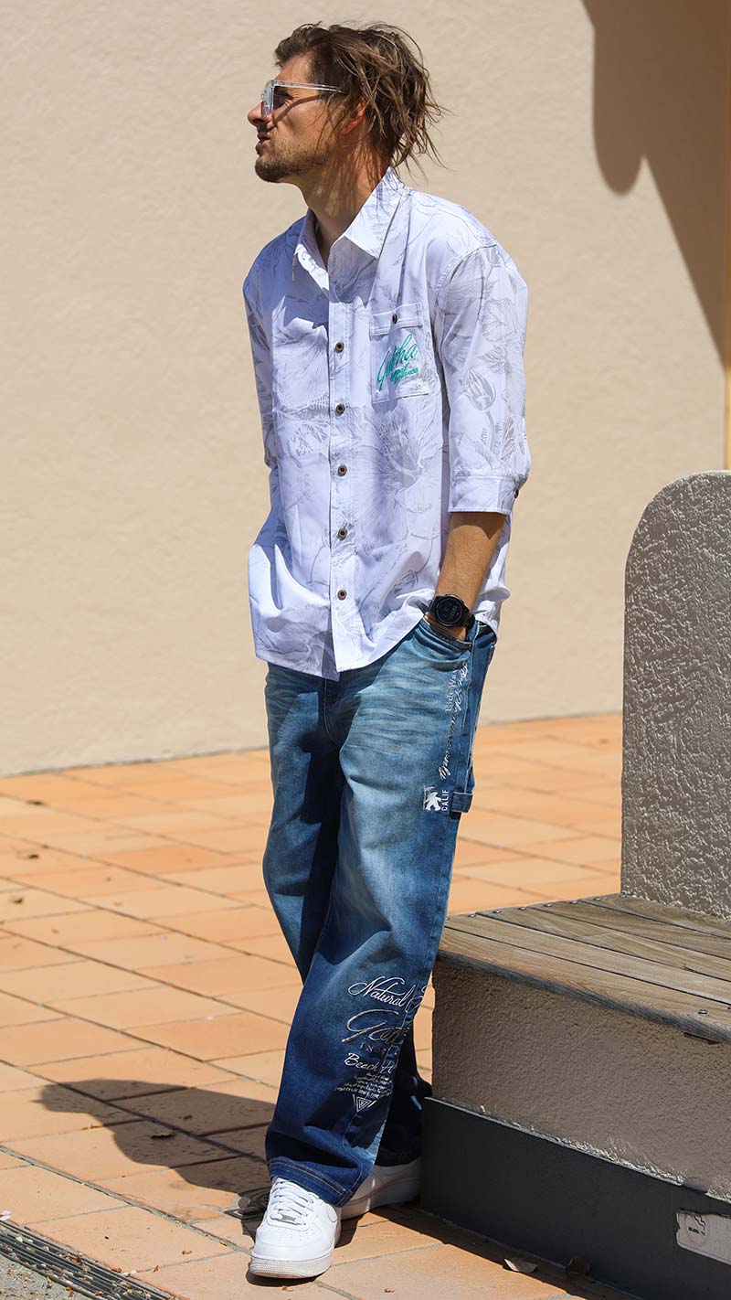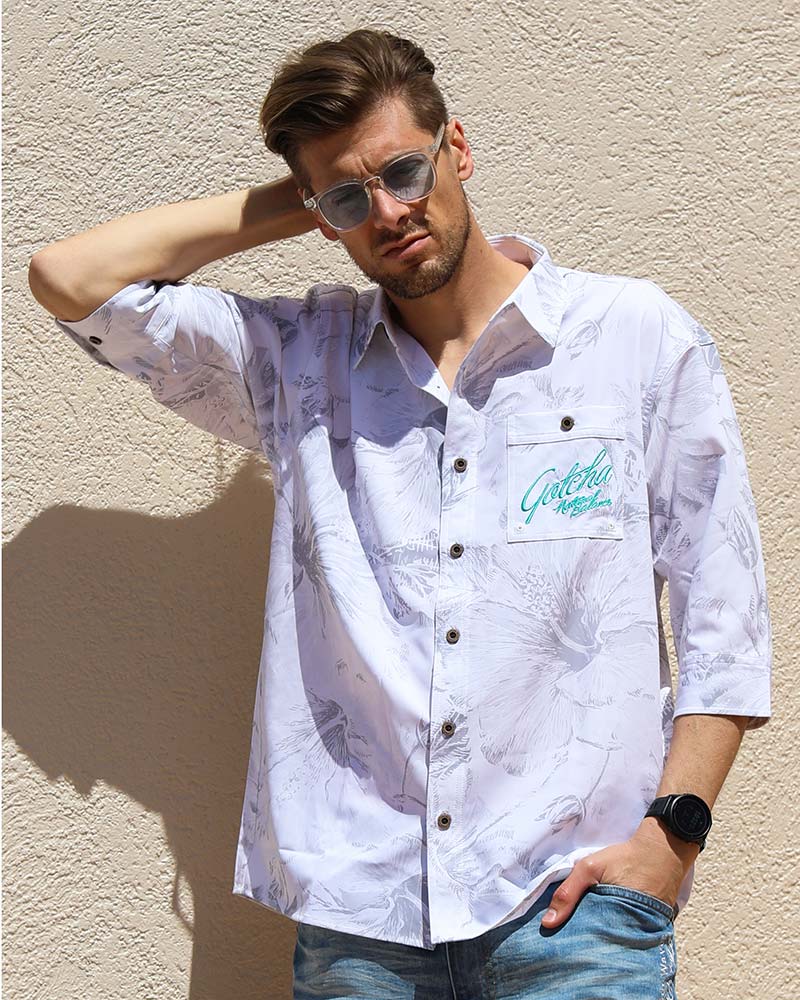 ハイビスカス総柄でトロピカルムードいっぱいに仕上げたルックスが存在感を放つ。 6分袖による爽やかさと美シルエットによるスマートさで清涼感のある装いに。 デニムパンツとも好相性で、夏のタウン着としても使い勝手抜群な水陸両用シャツ。