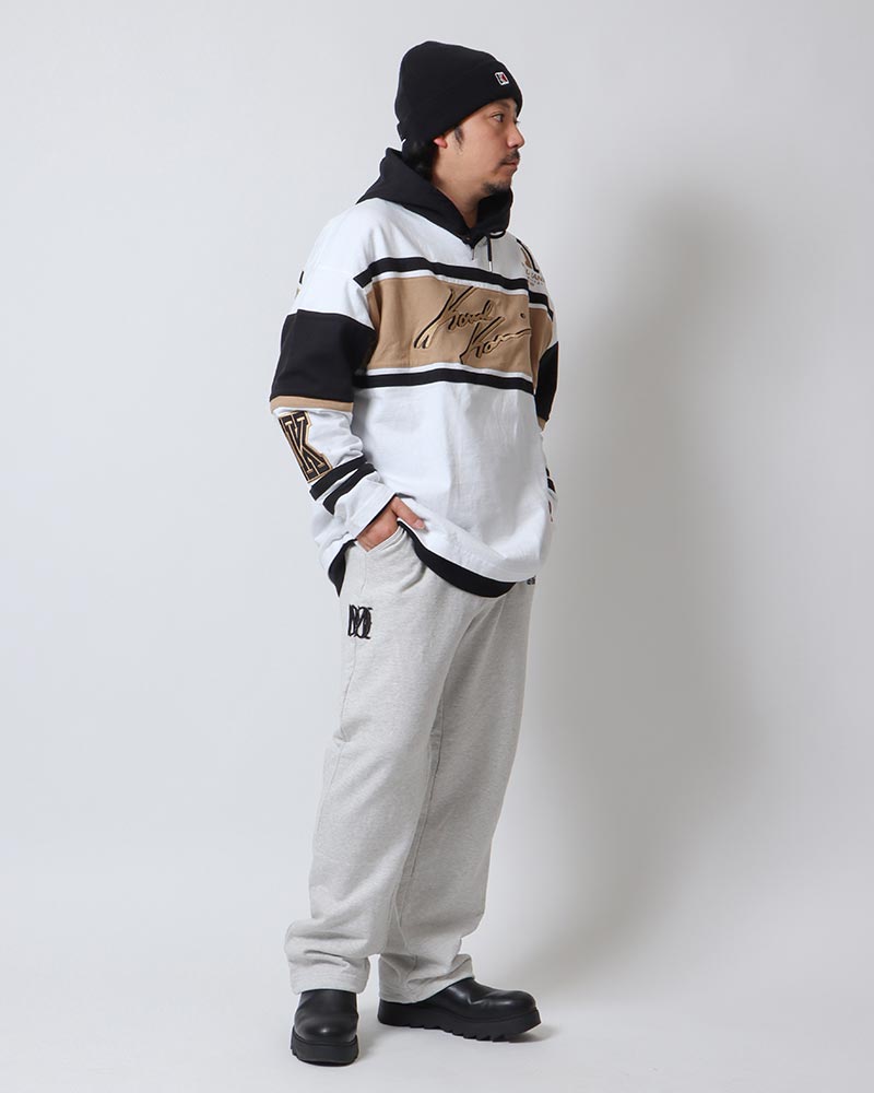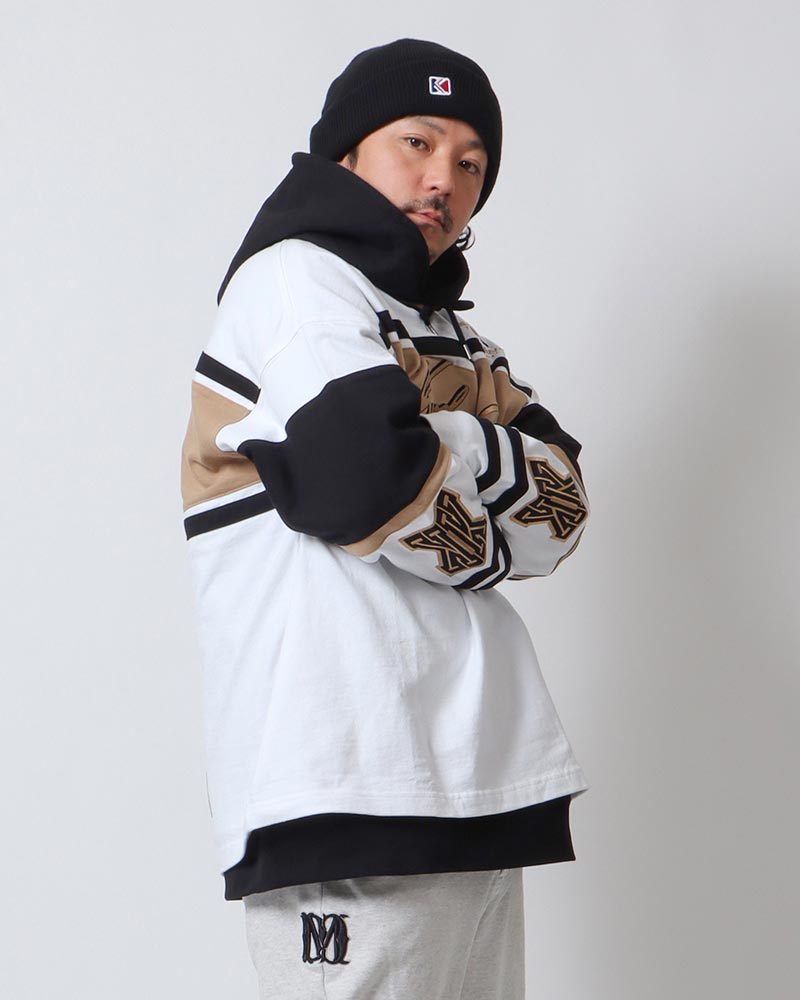 店内では、ホッケーシャツをモチーフに生まれたトレンドのホッケーロンTを使ったレイヤードスタイルで。