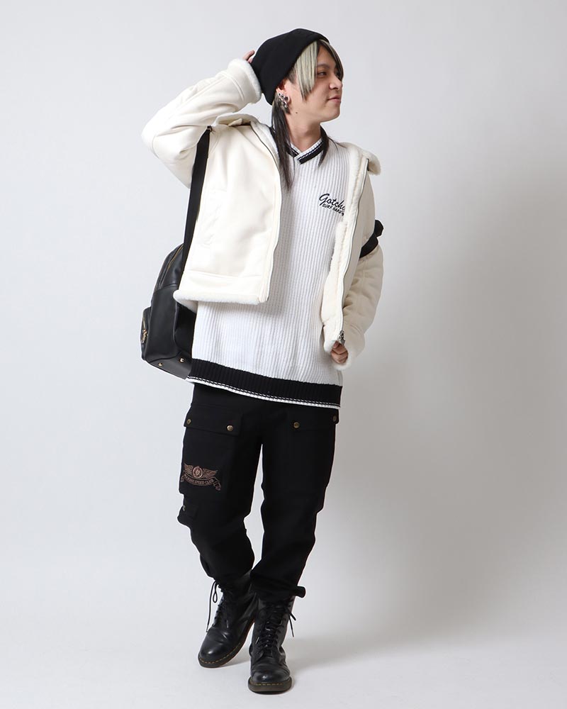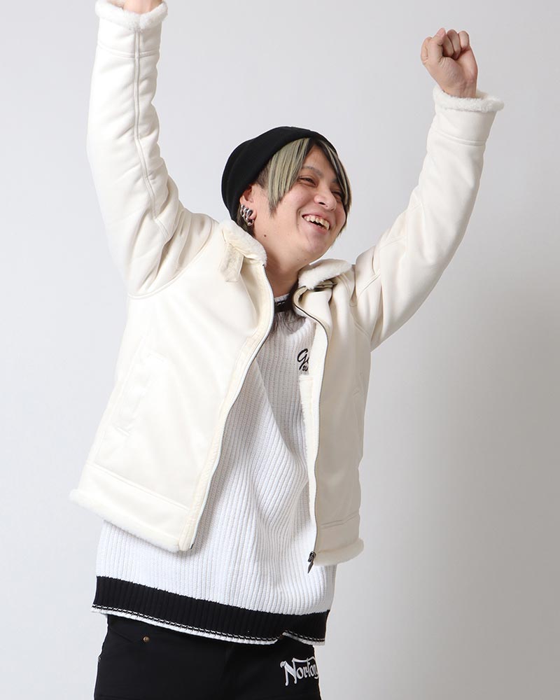 『今年の広島は寒いよ』と店長の加藤さんとエリアマネージャーのSJさんから言われましたので、ポリスウェード & ボアのアウターとニットで防寒です!