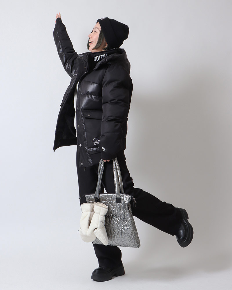防寒対策に重点は置きつつも、コーデはしっかり作りたいところ。手袋、ニットキャップ、メタリックバッグと、小物を効かせてコーデをブラッシュアップ。