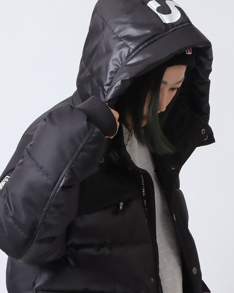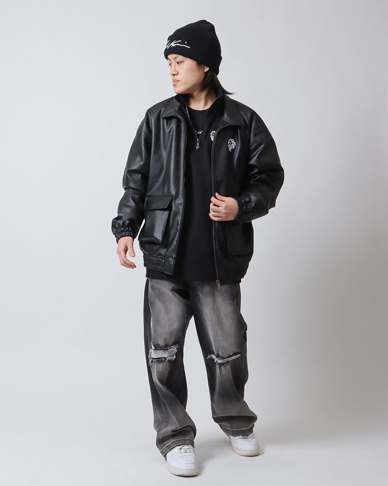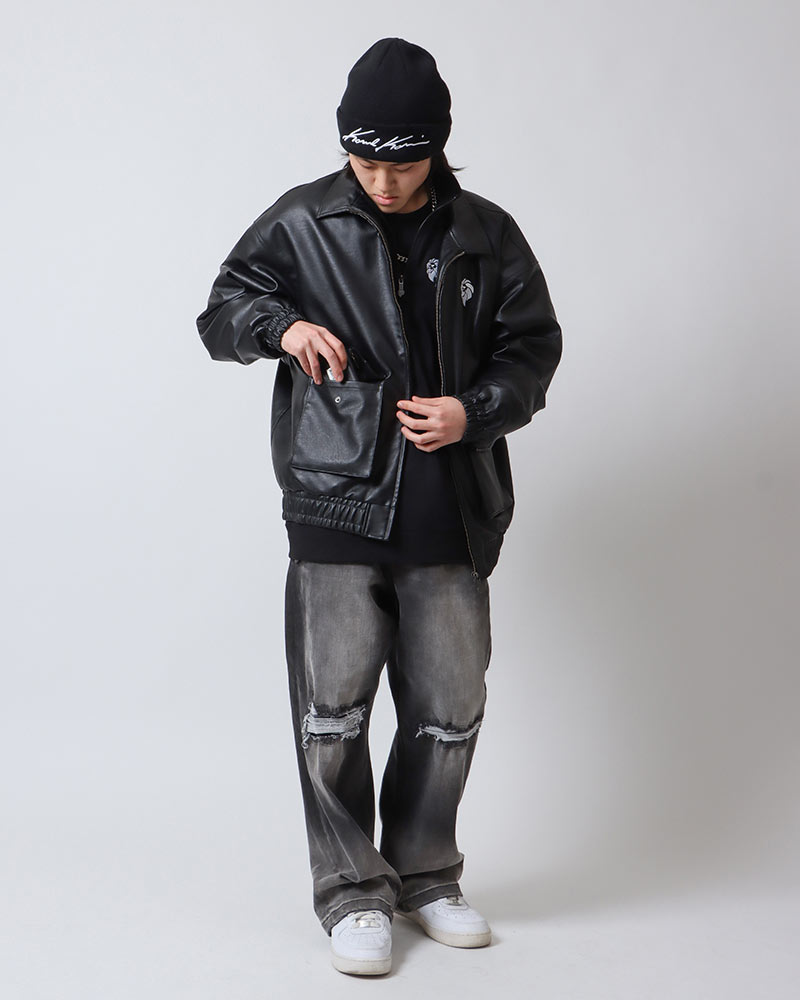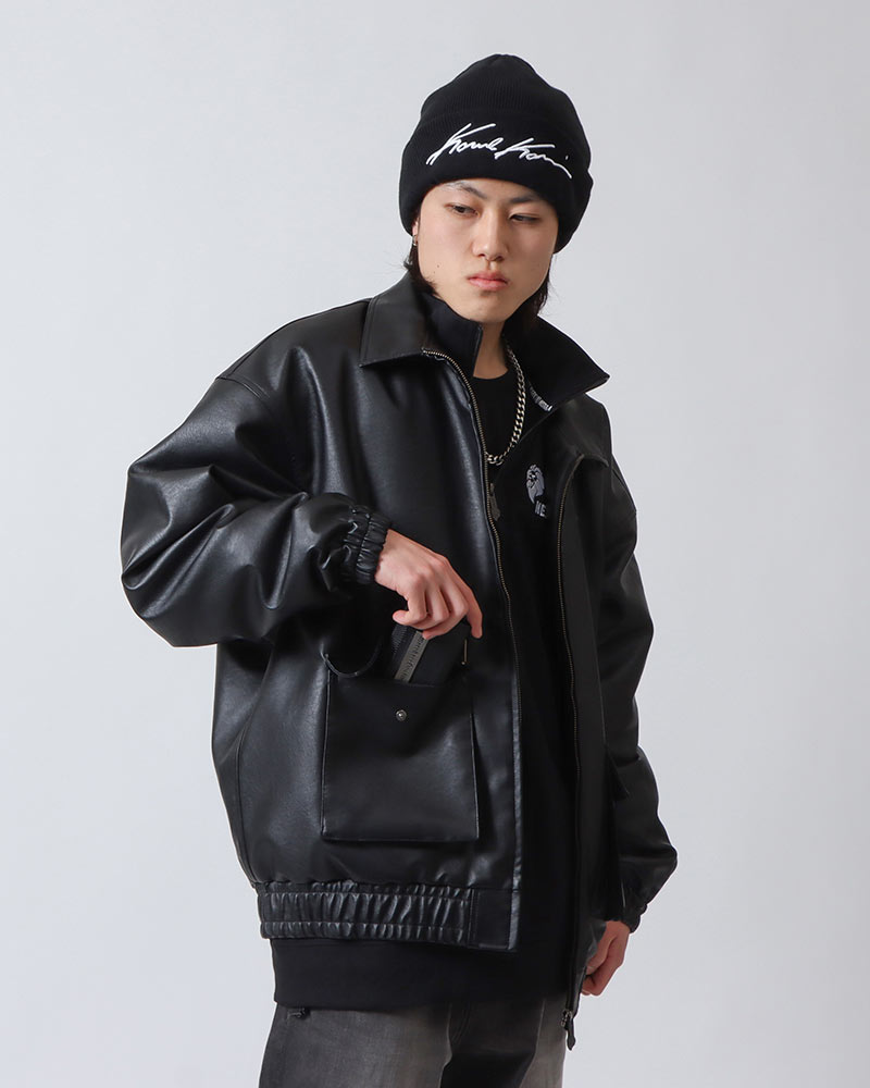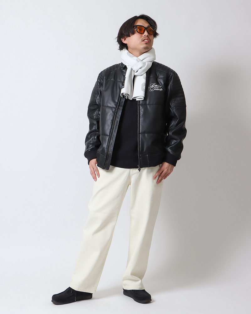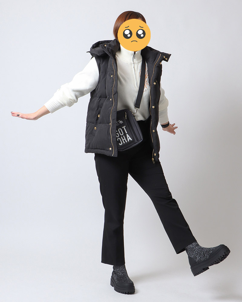 両サイドにはポケットが付いているので、スマホや財布など最低限の荷物を入れてサクッと準備しましょう♪お店に着いたらジャケットを脱ぎ、胸元を開けて温度調節を!お酒が入ってさらに暖まったら、スウェットを脱いでロンT一枚でもOK!(今回はブラックで統一しましたが、お好みのインナーを選んでくださいね♪)