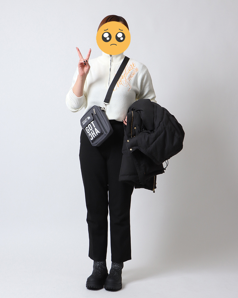 ニットがモノトーンの配色でしたので、パンツやワッチをブラックにし、ホワイトとブラックのみのモノトーンコーデにしました。