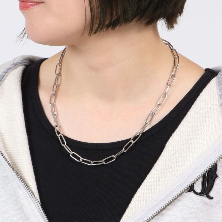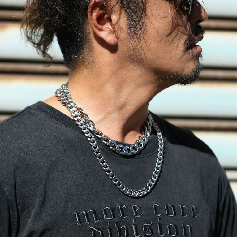 ストリートスタイルに特にぴったりな、チェーンネックレス。リングをフロントにしたスタイルと、リングを後ろに回して付けるスタイルの2WAY仕様です。