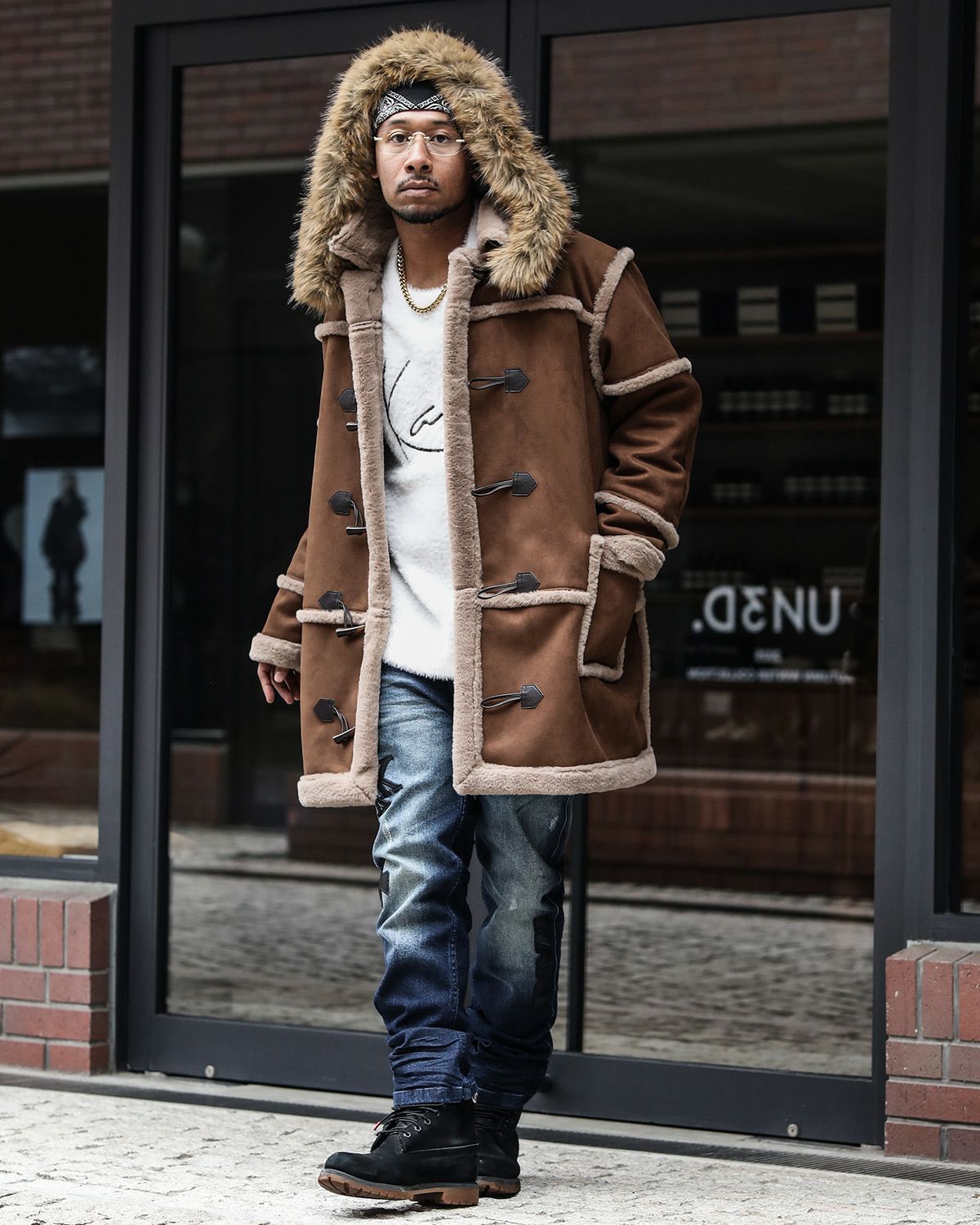 [Karl Kani] ファーフード 脱着 フェイクムートン ロングコート