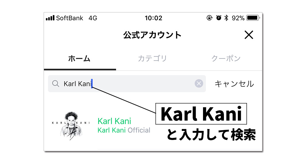 LINEアプリの公式アカウントの検索窓に「Karl Kani」と入力して検索し追加登録してください。