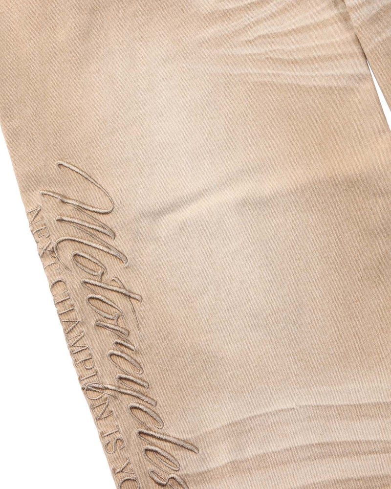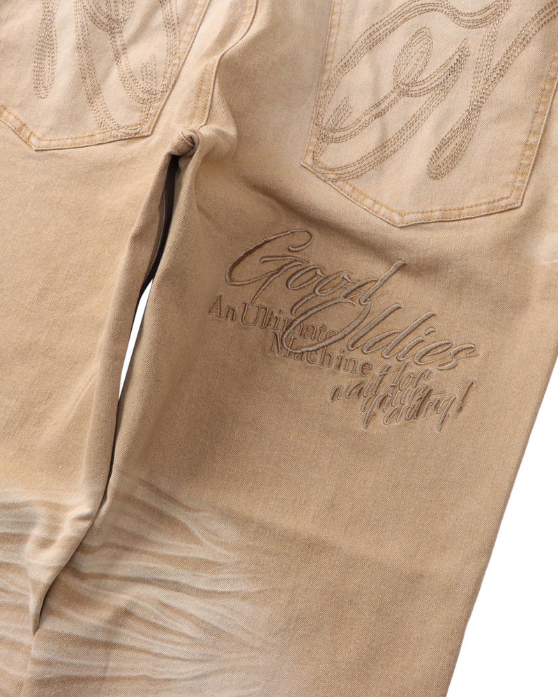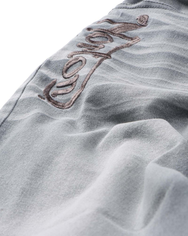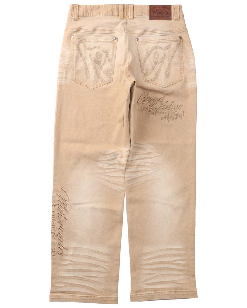 ももや裾に施されたヒゲ加工やブリーチ加工がヴィンテージ感を演出し、こなれた表情に仕上げています。