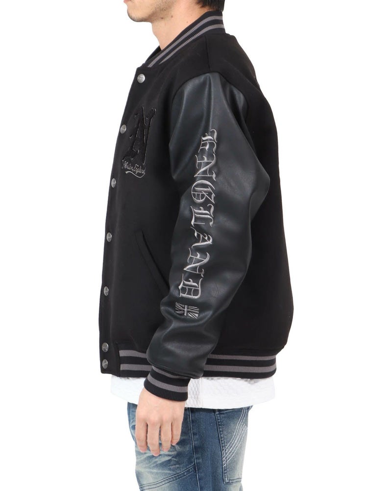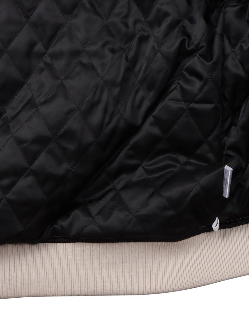 秋冬らしいぬくもり感が魅力のメルトン素材と袖はしっかりとしたPUレザー素材に。内側は薄中綿入りダイヤキルトで保温力も◎