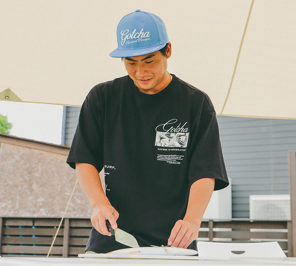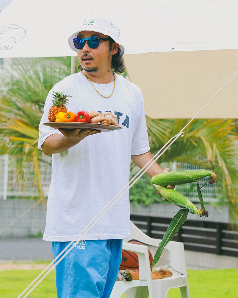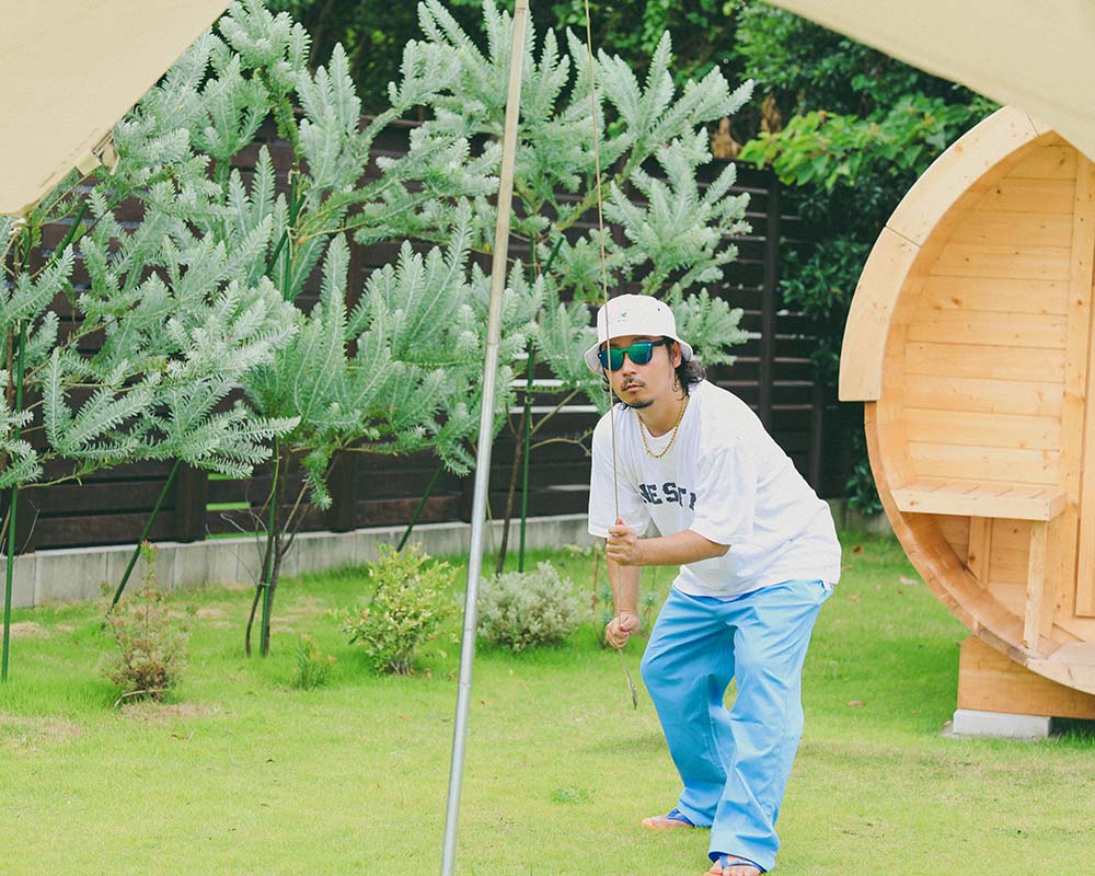稲葉選手のデイキャンプコーデは、自然に合わせたカーキショーツをベースにしたキャンプ&サーフスタイル。従来よりもややゆったり、かつ丈の長さが従来よりやや短めの動きやすさも兼ね備えたカーゴショーツは稲葉選手お気に入り。