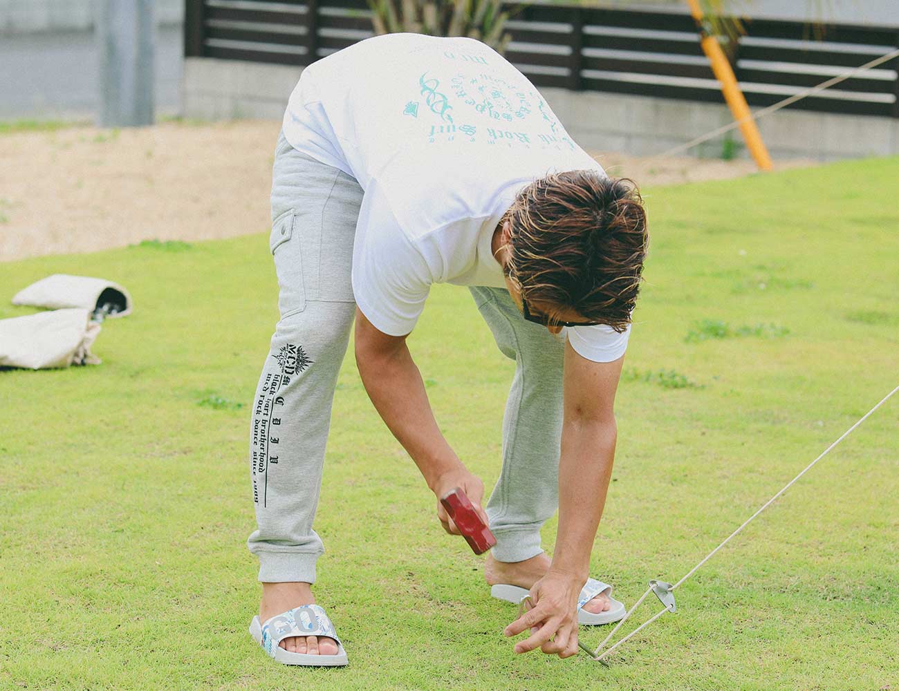 NAOTOはラフにスウェットカーゴにグリーンプリントを使用した白Tで爽やかかつ自然の緑を意識。このスウェットパンツは生地も非常に薄く、