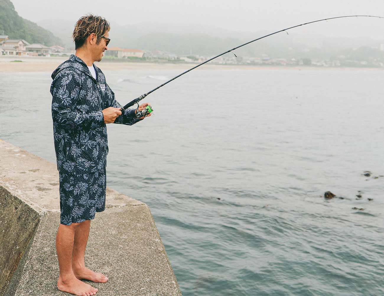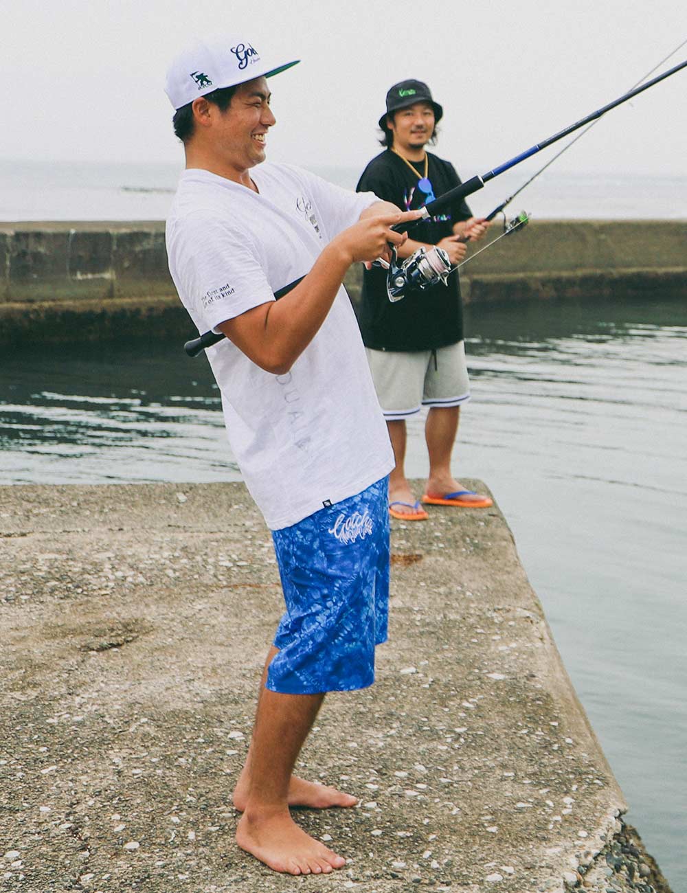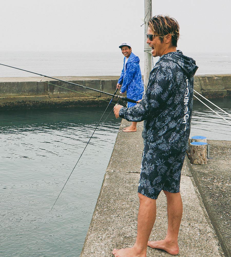 今日はPEETサーフチームの二人と夏遊び♪ BBQもやる予定なので、食料調達も兼ねて、稲葉プロの趣味でもある釣りに、ゴルフ部部長NAOTOとRAPPIでくっついていきました(笑)朝はちょっと肌寒いので、水陸両用のセットアップくらいがちょうど良いです。 ※この日は波が良くなかったのでサーフィンはしてません(笑)