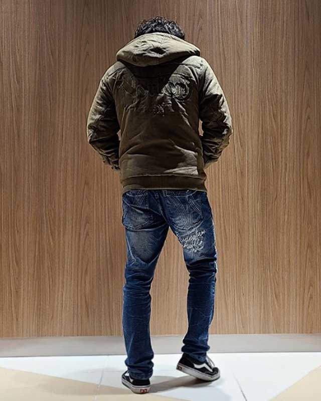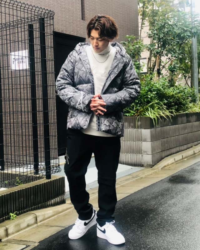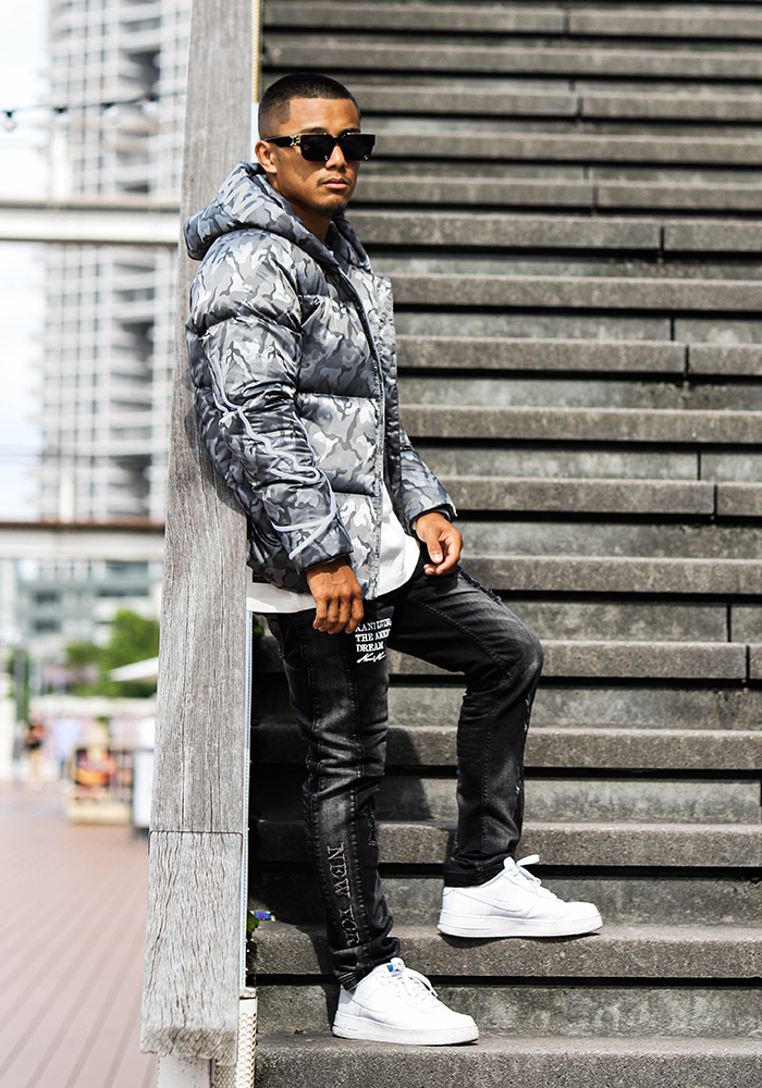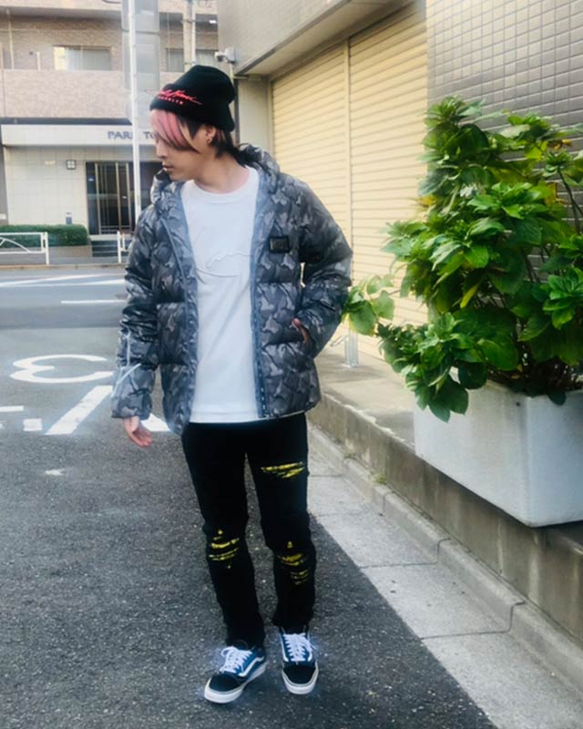 今シーズン唯一のダウンジャケット。 メタリックなカモ柄はジャガード織りで表現しております。シルバーを最大限に生かすため、ポイントで使用している刺繍は全て同色で馴染ませています。他にない、KANIだからできる唯一無二のアウターです。