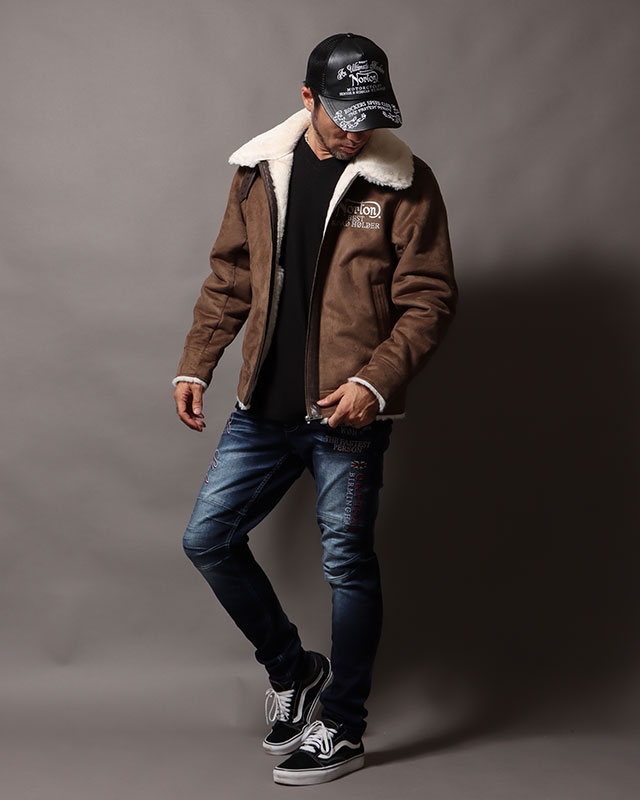 高級感溢れる風合い豊かなフェイクムートン。 ハードなルックスと重厚感が魅力的なフェイクムートンジャケット。 裏地は、柔らかく肌触りの良いストレートボアで着心地も抜群です。また、衿を立ててスタンドタイプにすることも出来ます。