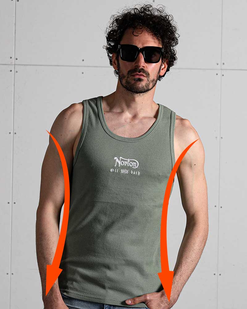 伸縮性に優れフィット感のあるテレコ素材タンクトップ。ランダムな凸凹のある表面感が特徴で、男らしさ・シャレ感UP!!!