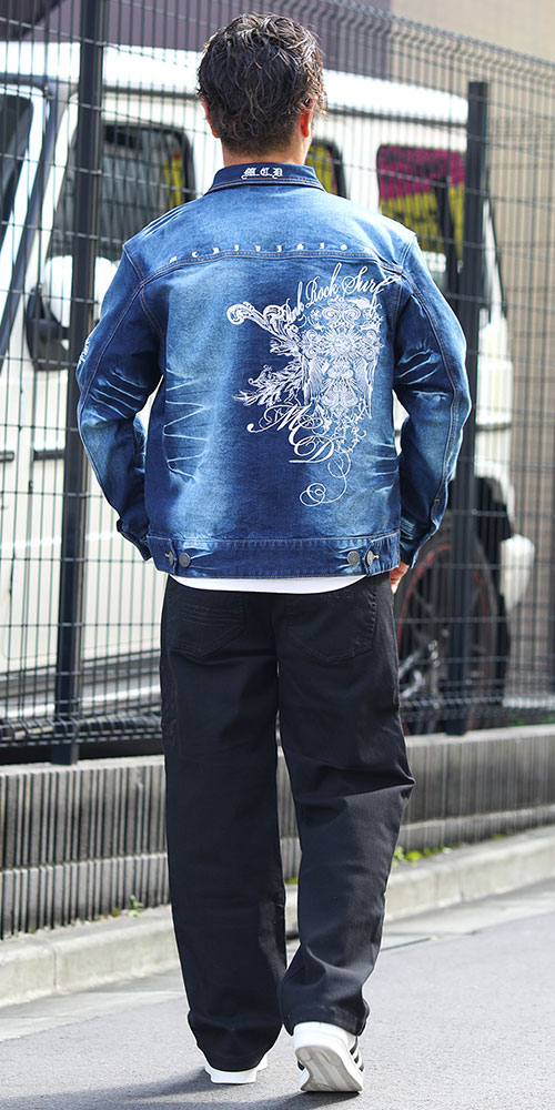 [MCD]ストレッチ バックタトゥー 刺繍 デニムジャケット (243M1602)