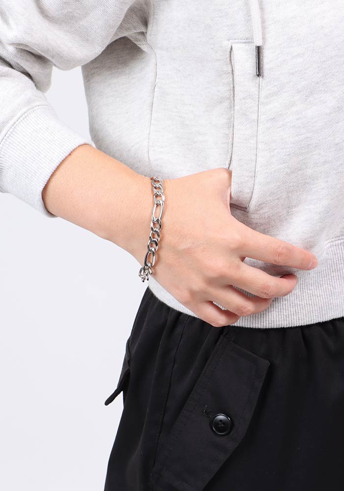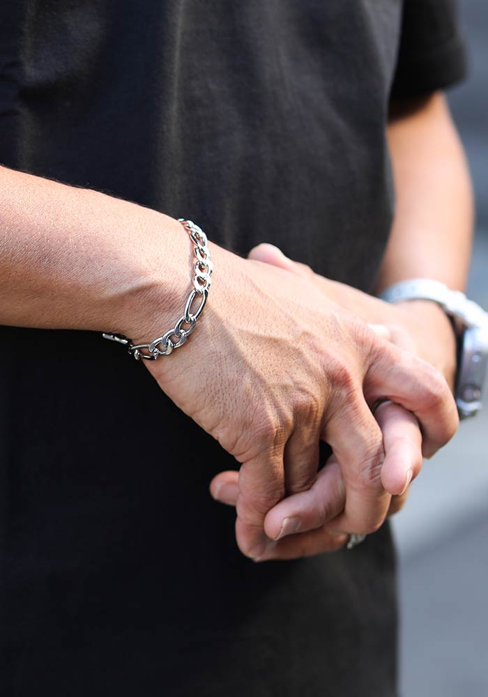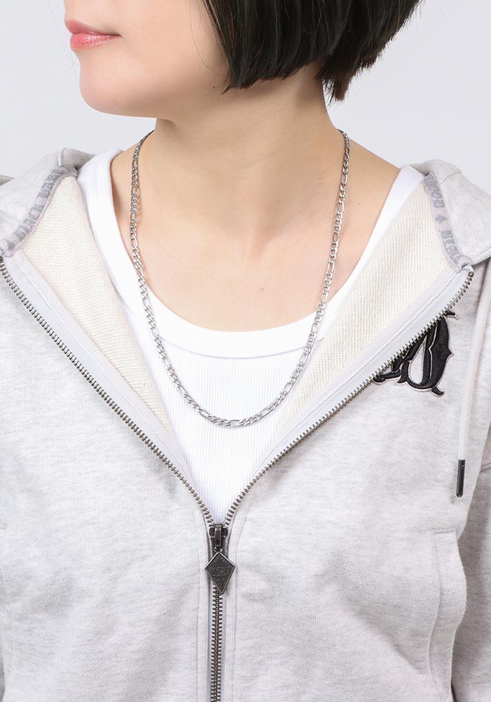 2つの円形リングを使用した60cmのフィガロチェーンネックレス。抜け感もあり男女共に使いやすいアイテム。円形リングのサイズはブレスより小ぶりにしており、様々なスタイリングにマッチ!