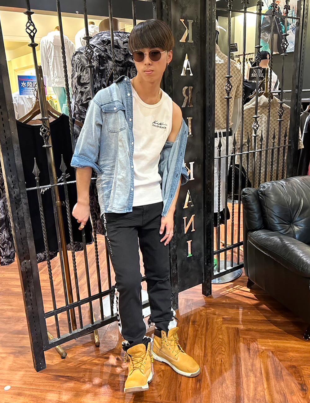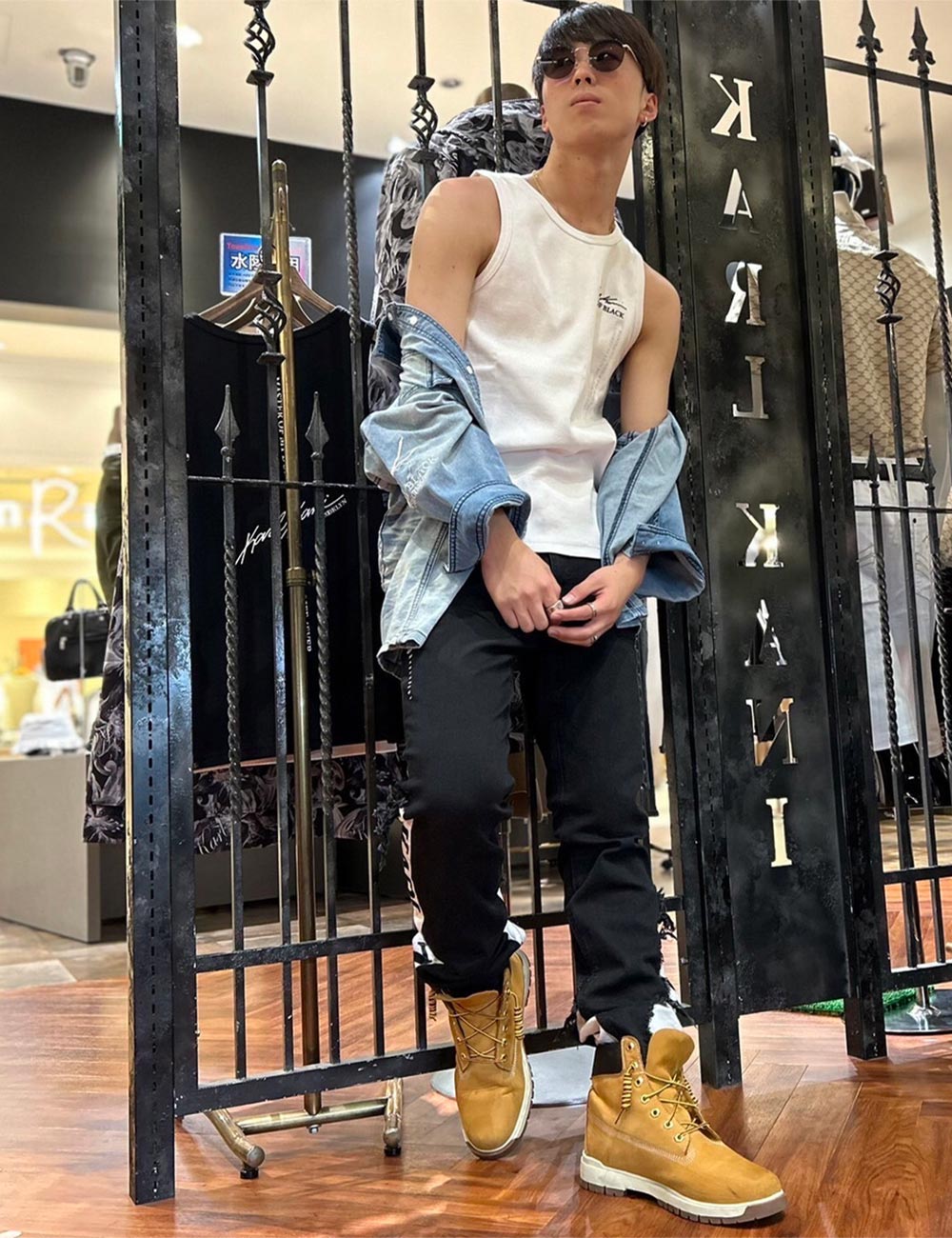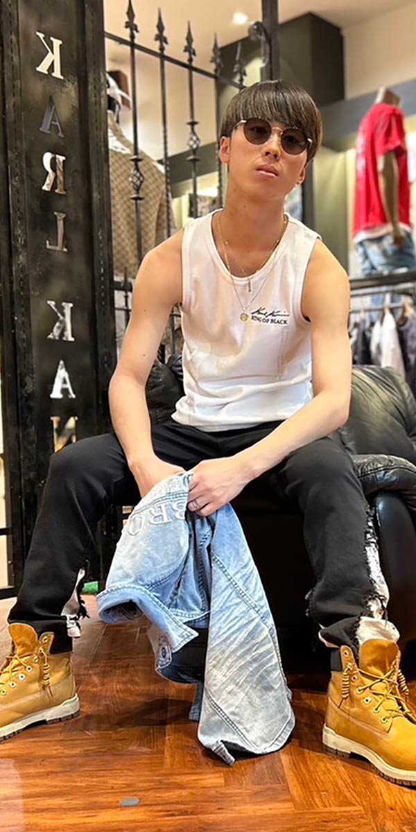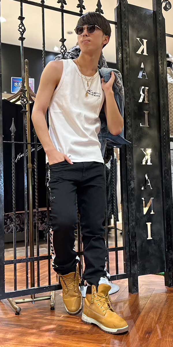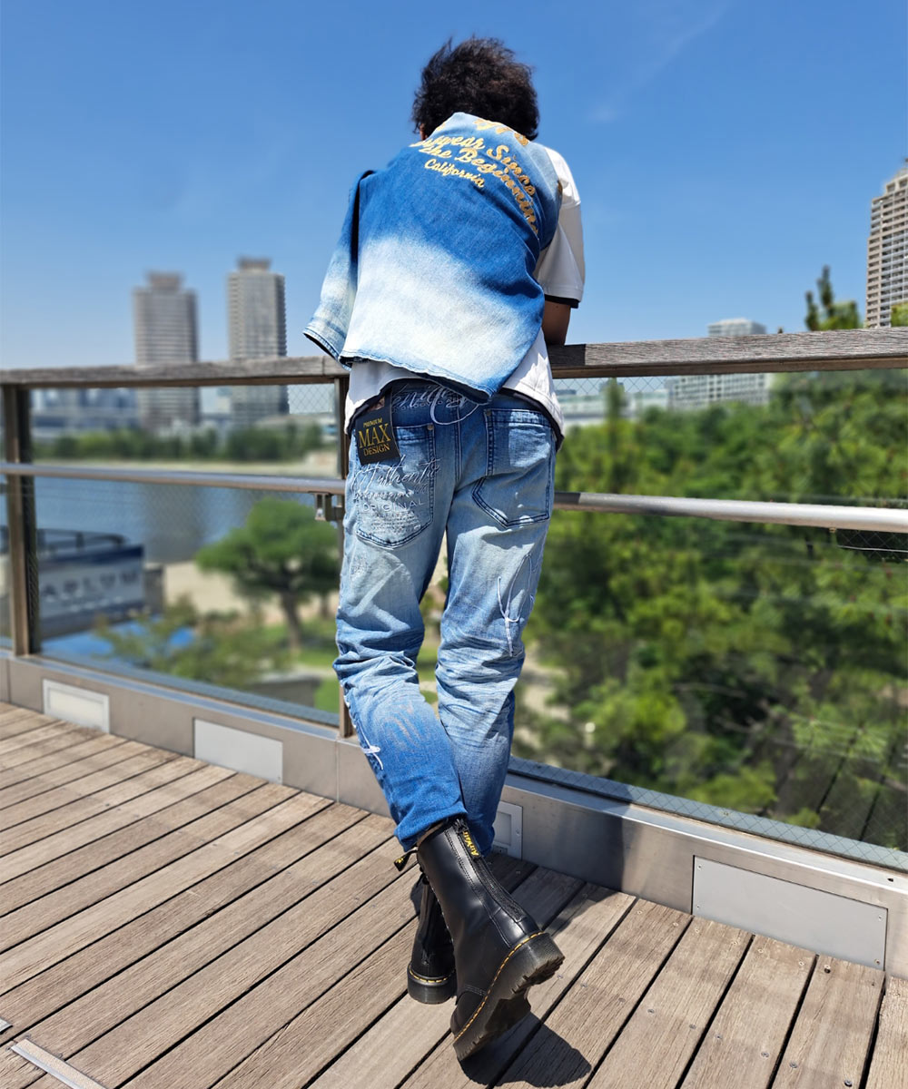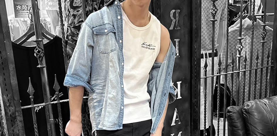 90年代から現代までを熱狂させている某ロックボーカリストをイメージし、夏らしさ溢れるブルーグラデーション刺繍の施されたトップスに加え、ロックな雰囲気を出す為にパンツだけサイズを下げてタイトスタイルを演出しています。