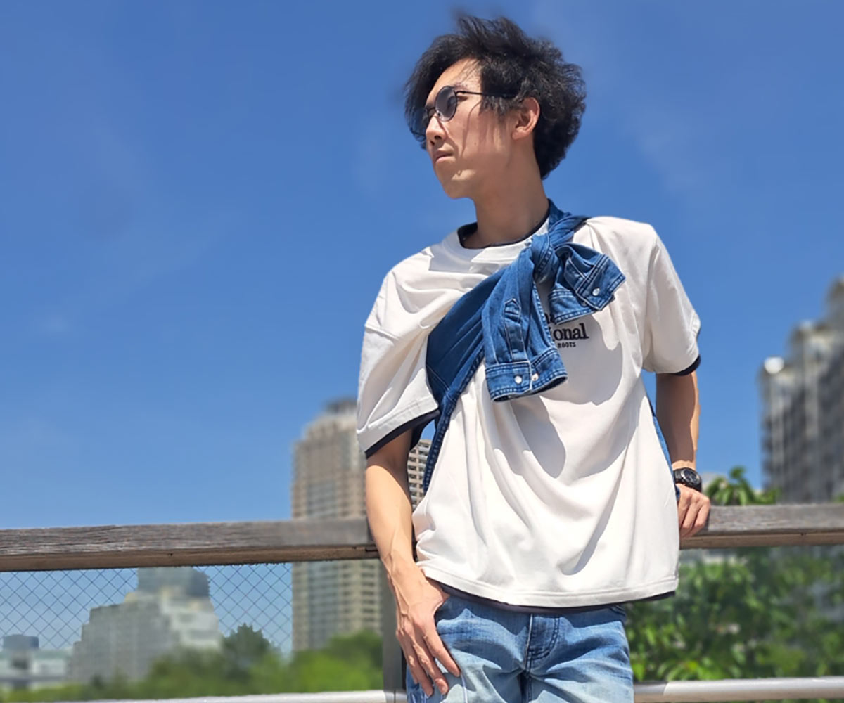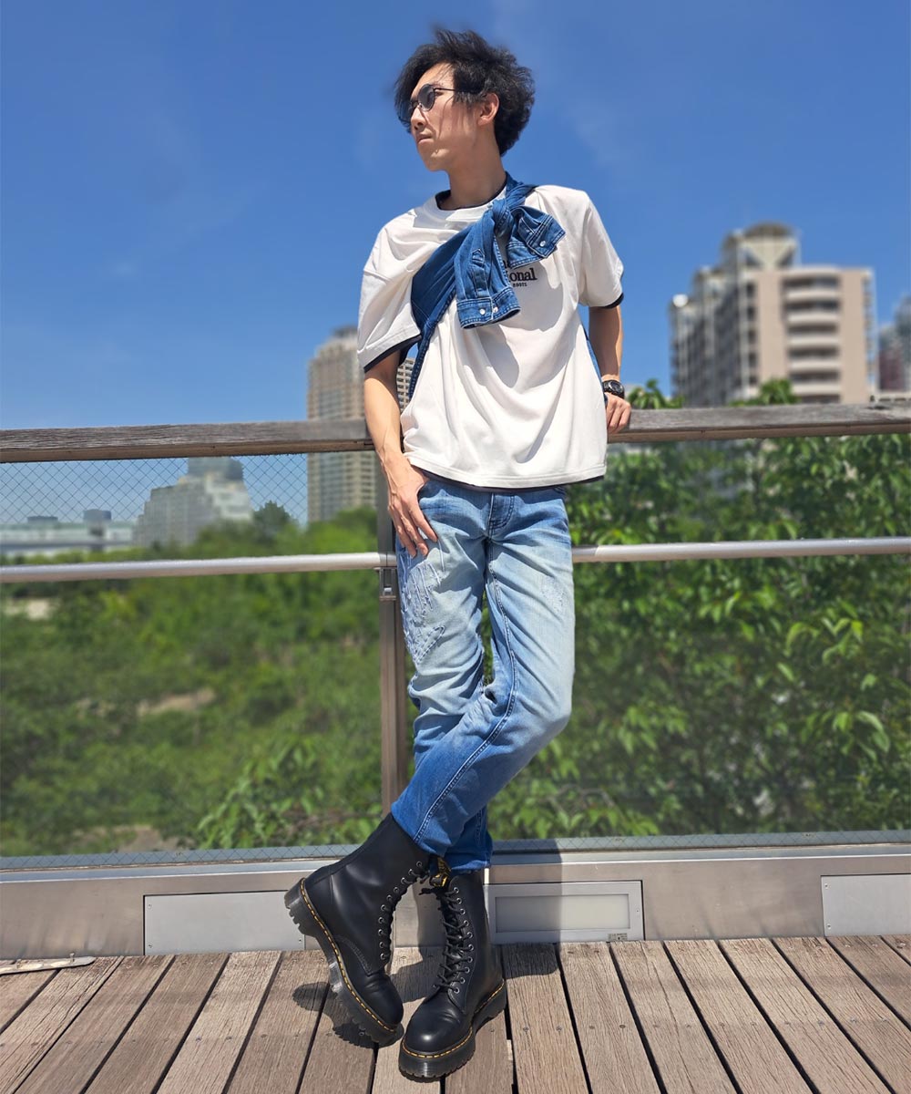 シャツの鮮やかなデニム色合いをメインとする為、色の抜け具合の近いデニムパンツと合わせることで、バックシルエットでのデニムを強調しております。タスキ掛けで背面が隠れてしまうので、デニムスタイルと喧嘩しないようロゴや刺繍などが少ないシンプルなトップスを着用して、色味のバランスを調節しております。