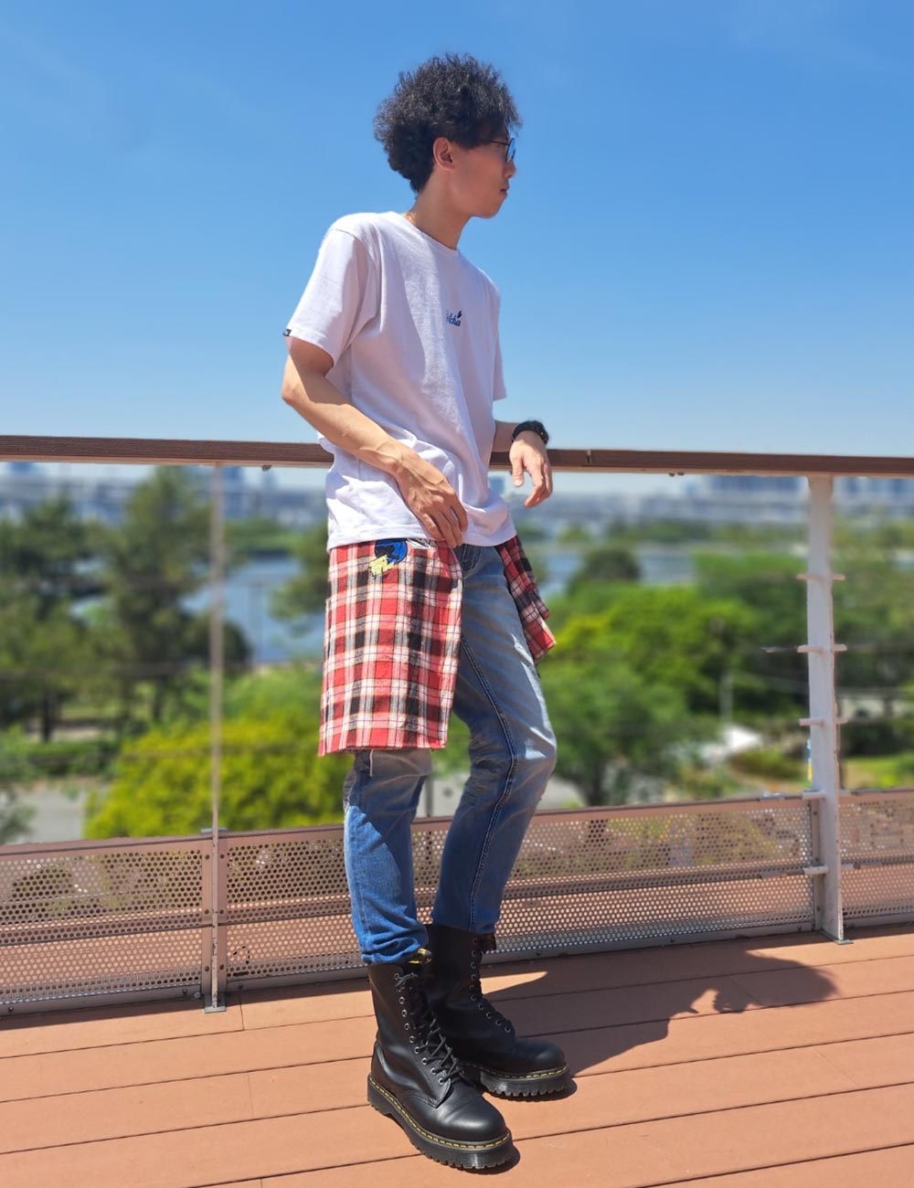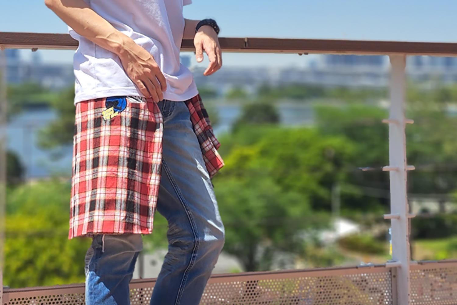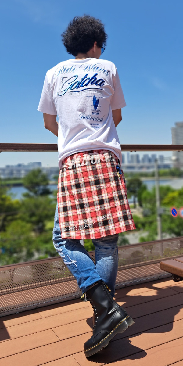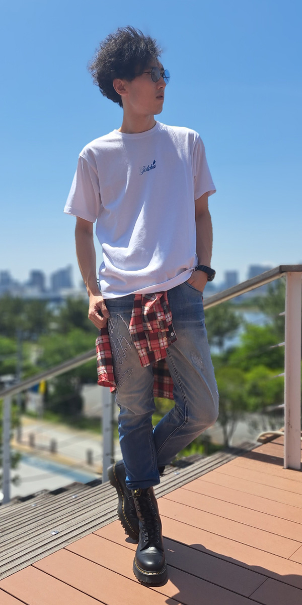 自分が普段着用するサイズより1つ大きいサイズのシャツを使うことで、腰巻きでのシャツ面積を広くしてアクセントを増長させています。 90年代から現代までを熱狂させている某ロックボーカリストをイメージし、夏らしさ溢れるブルーグラデーション刺繍の施されたトップスに加え、ロックな雰囲気を出す為にパンツだけサイズを下げてタイトスタイルを演出しています。