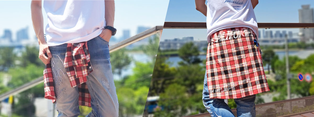 自分が普段着用するサイズより1つ大きいサイズのシャツを使うことで、腰巻きでのシャツ面積を広くしてアクセントを増長させています。