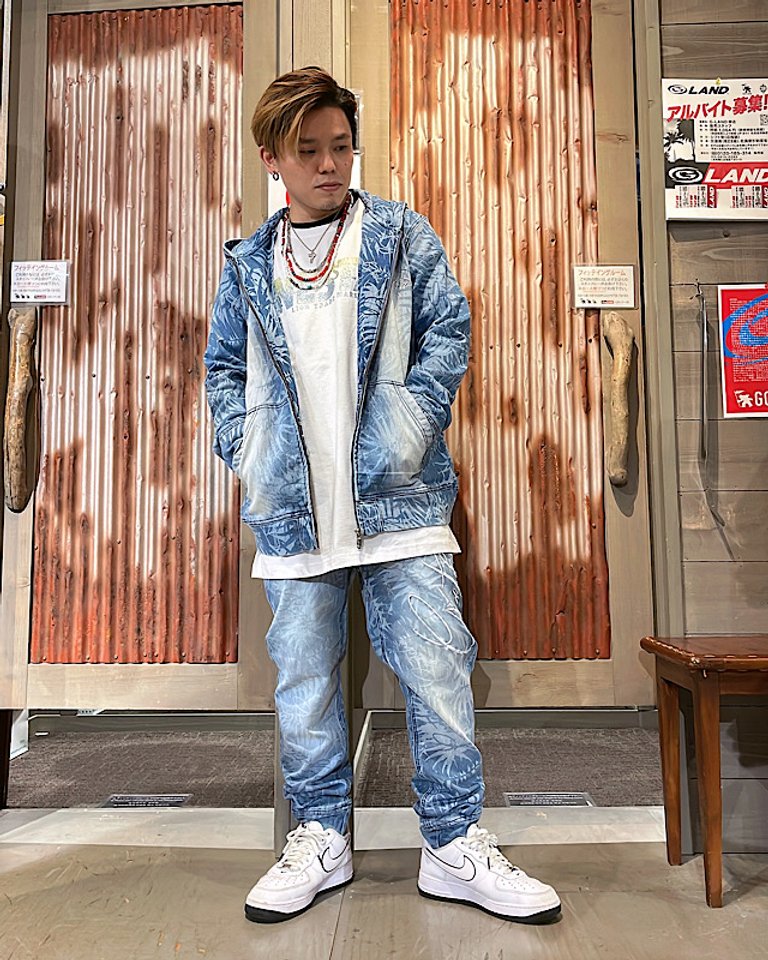誰とも被らない!!個性派デニムセットアップパーカーリーフ総柄を落とし込んだサーフテイスト溢れるデニムセットアップ!! 素材 綿80% , ポリエステル19% , ポリウレタン1% サイズ XS~XXXL カラー ブリーチ
