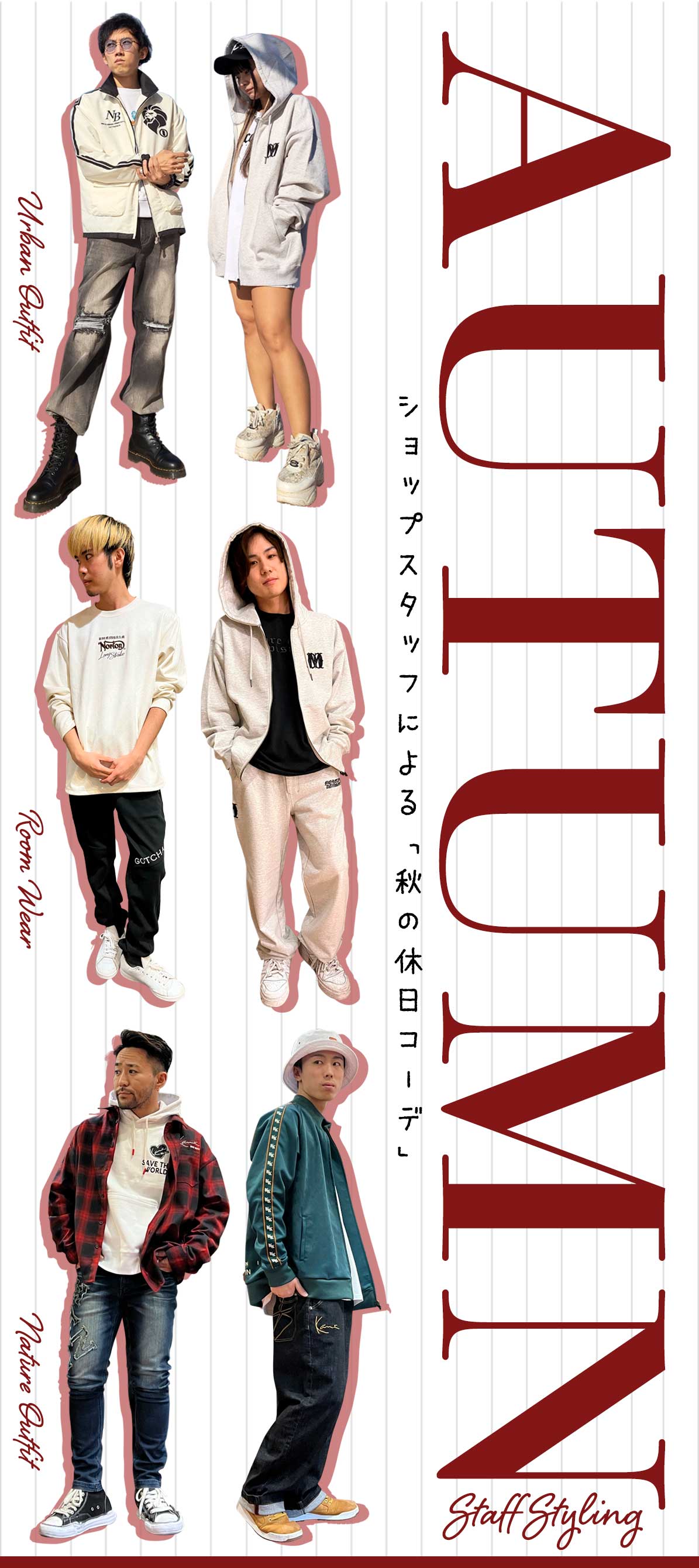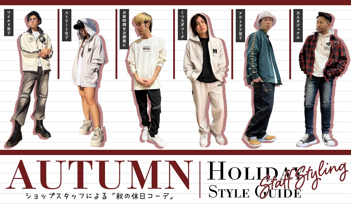 KYOSUKE (G-LAND TOKYO-BAY店) 涼やかに秋の街並みを満喫するイメージでコーディネートしました。Jacketは軽量・撥水加工で急な天候不良にも対応出来るモノを、インナーには防寒対策で厚すぎないトレーナーを合わせています。トップスを柔らかなオフカラー系統で纏めたので、パンツは少しアグレッシブなカラーとデザインで。