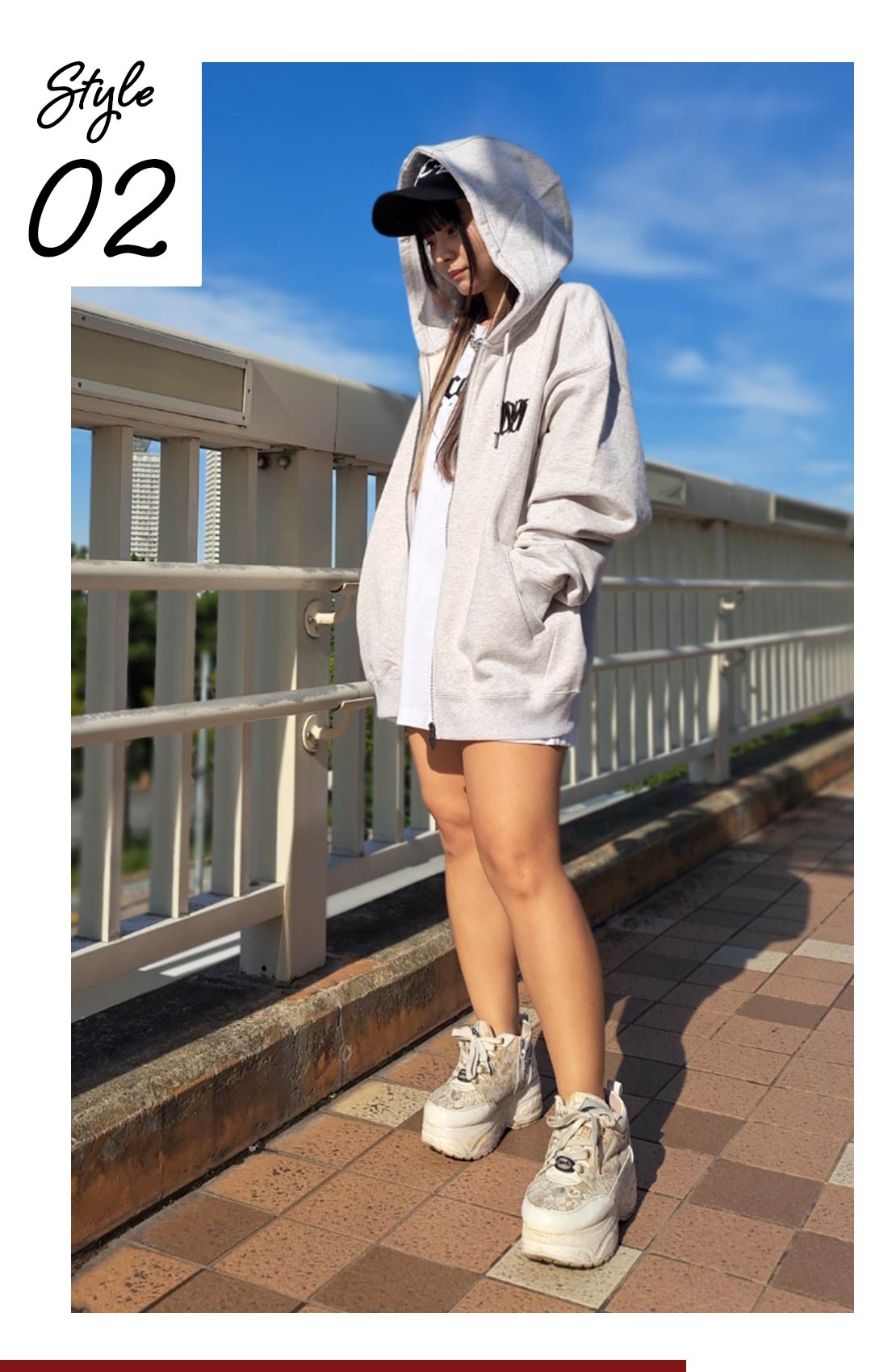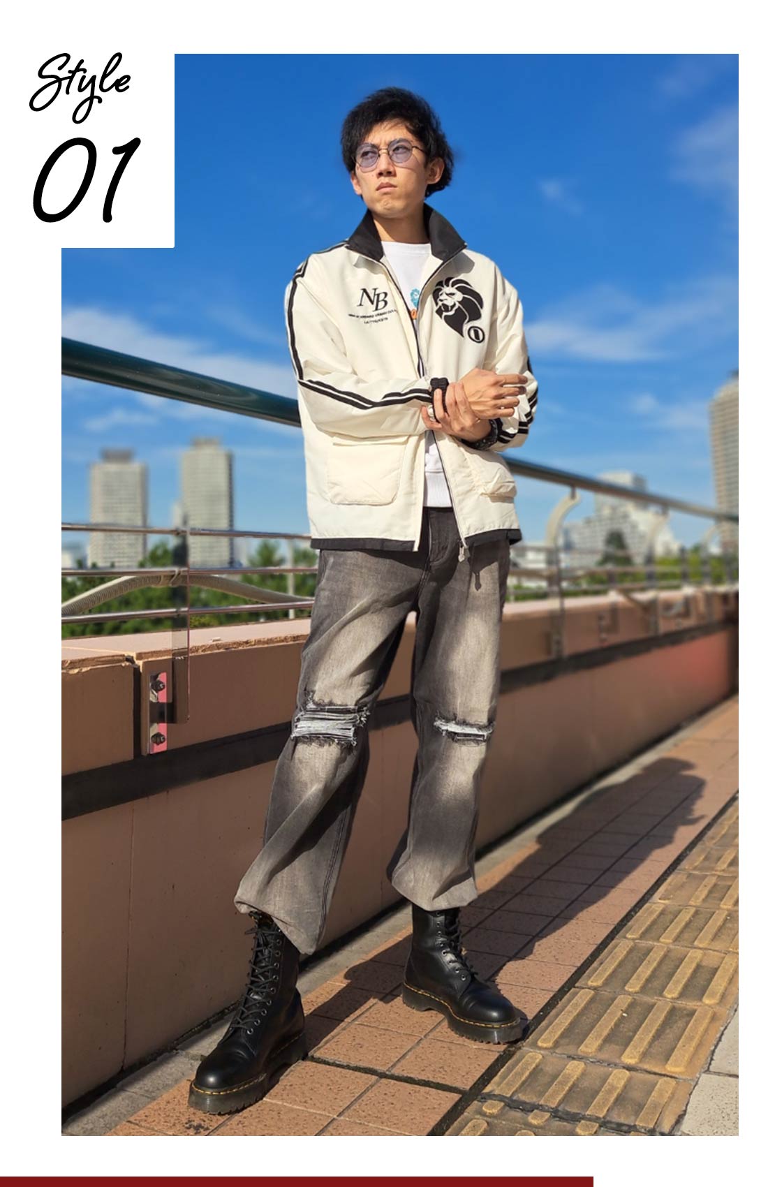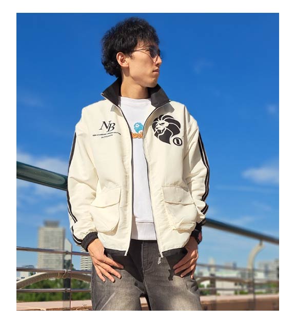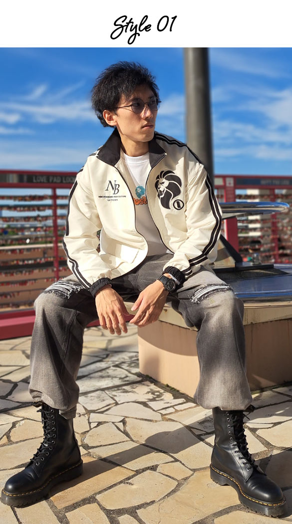 ジャージ素材のジャケットにオーバーサイズのデニムでどんなシーンでもアクティブに動けるスタイリングにしてみました。