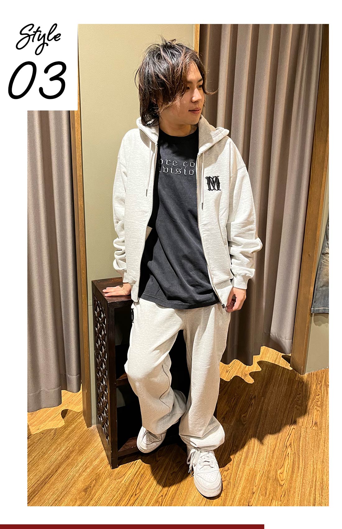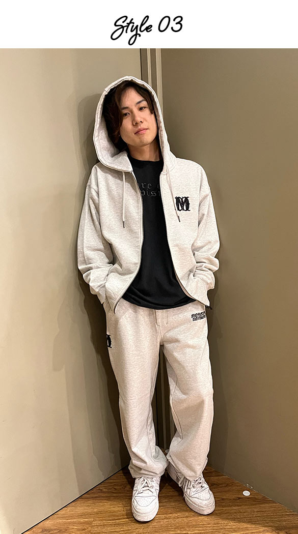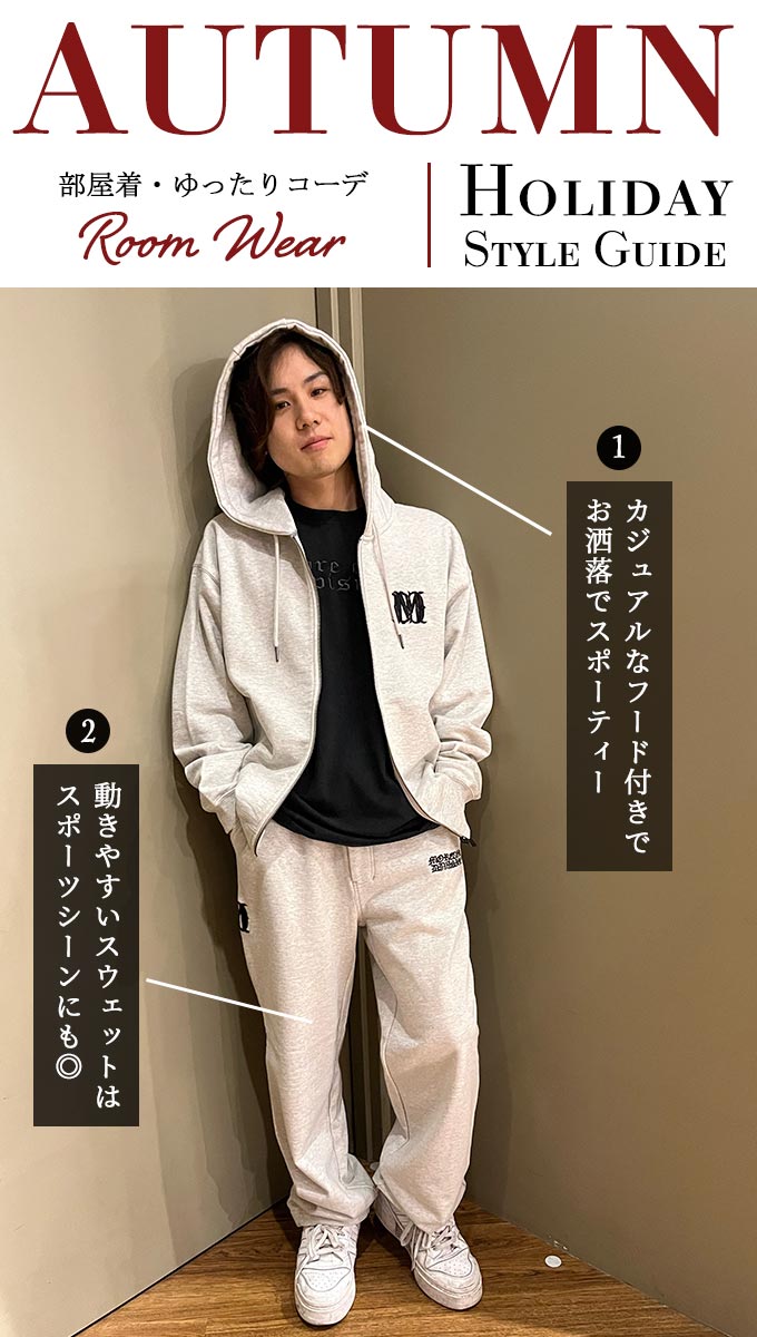 KEN-TUU (G-LAND 岡山店) 部屋着=セットアップだと思うのでMCDの新作セットアップをチョイスしました。上下ゆったりとした仕様になっているのでお家でのリラックス時間に最適です!生地も丈夫なので何回洗っても毛玉になりづらいので年単位で活躍してくれること間違いないです。ちなみに、MCD35周年の限定アイテムなのでファンの方必見です♪トップスはあえてオーバーサイズを選び、くつろぎやすさを重視しました。スウェード素材は肌触りが良く、シワになりにくいので部屋着に最適です!