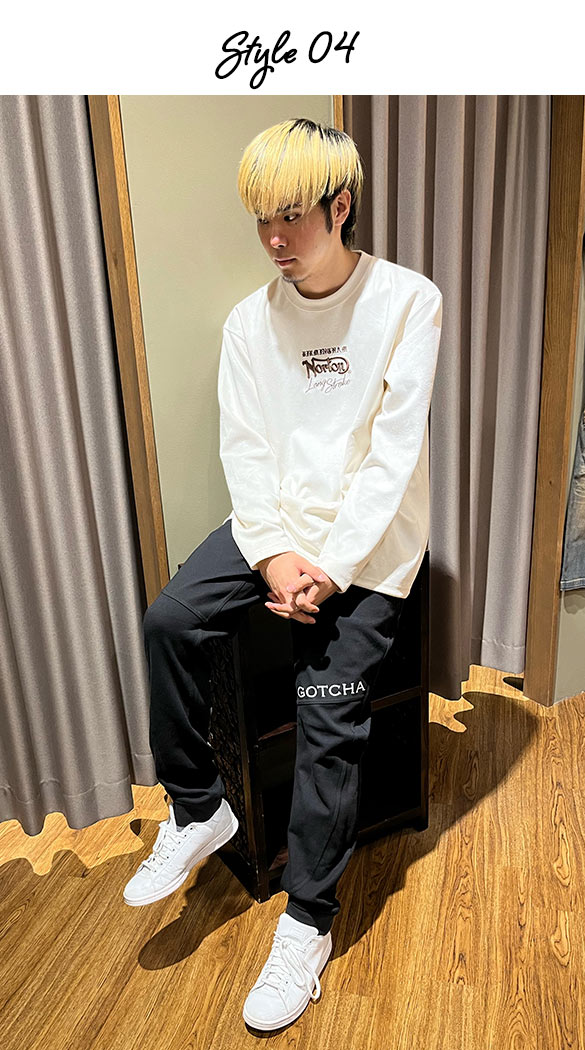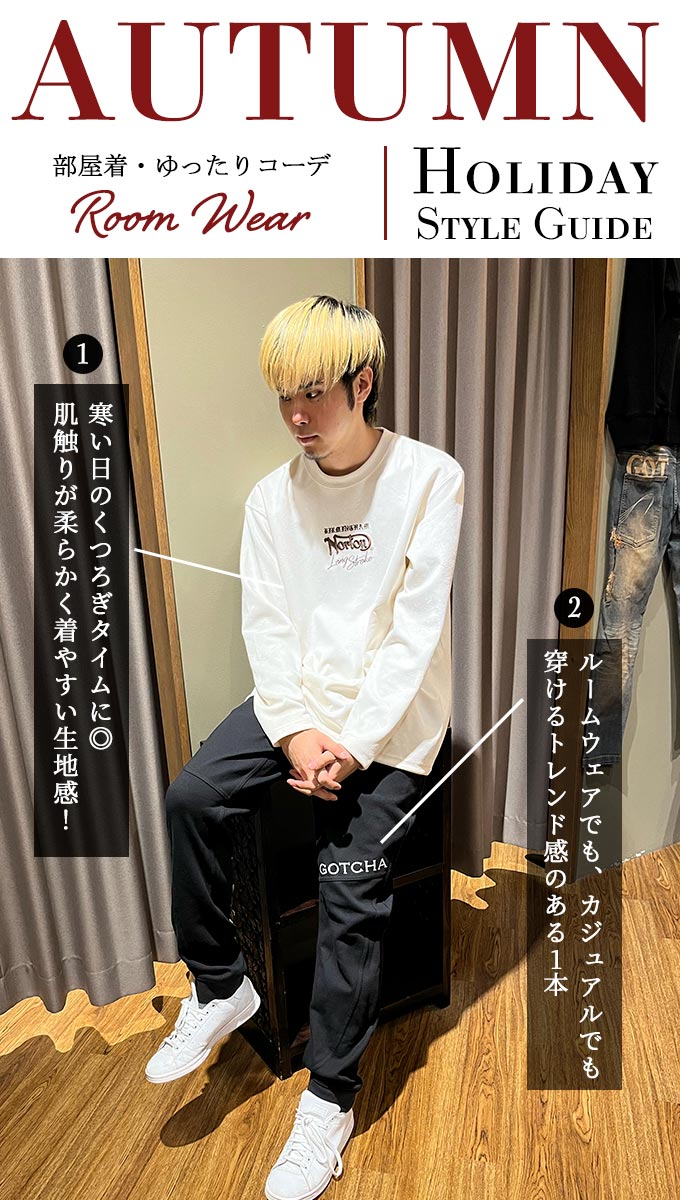 あっきー (G-LAND 岡山店) トップスはあえてオーバーサイズを選び、くつろぎやすさを重視しました。スウェード素材は肌触りが良く、シワになりにくいので部屋着に最適です!パンツはストレッチが効いており、トップスと合わせて落ち着いた雰囲気が出せるものを選びました。