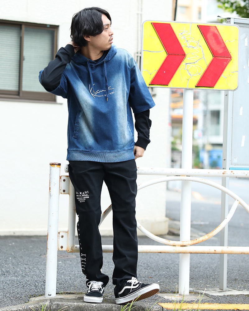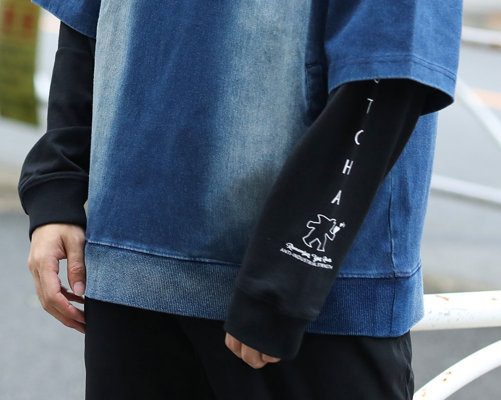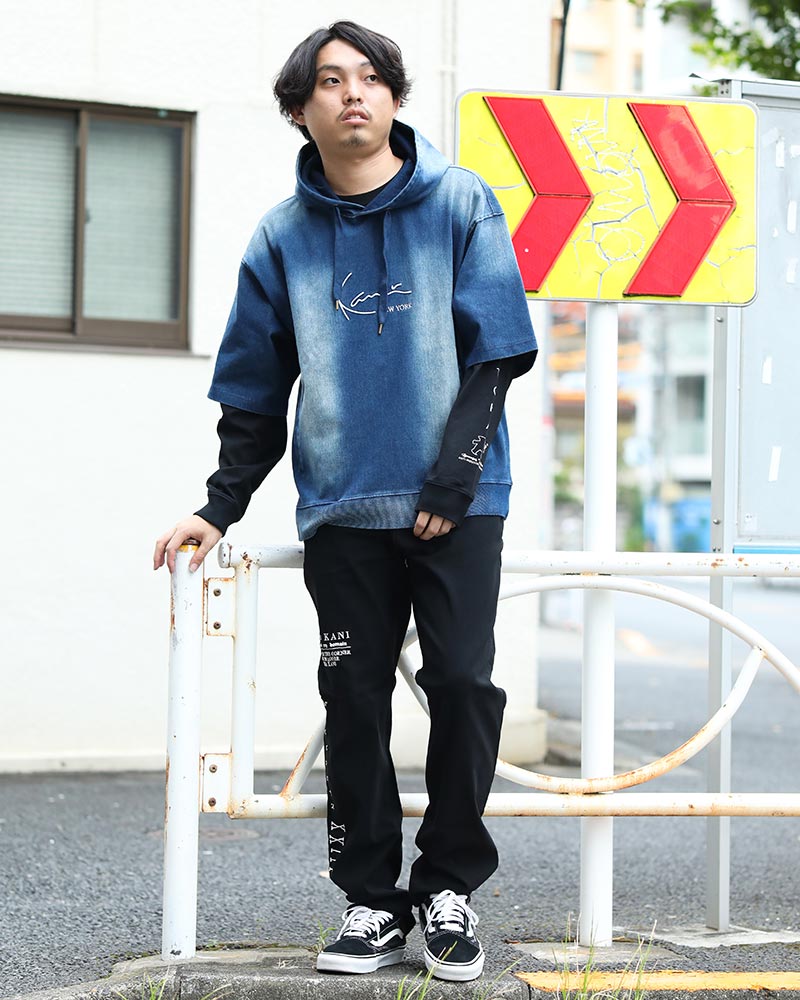 ダボッとしたルーズなシルエットが魅力の デニム半袖パーカーが主役。 細身パンツを合わせることで黄金比コーデが完成。 ロンT&ボトムスはブラックカラーで統一。 身長173cm TOPS:L BOTTOMS:34inc