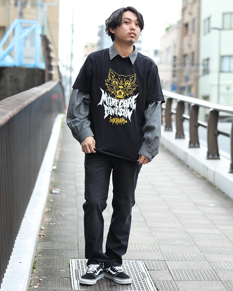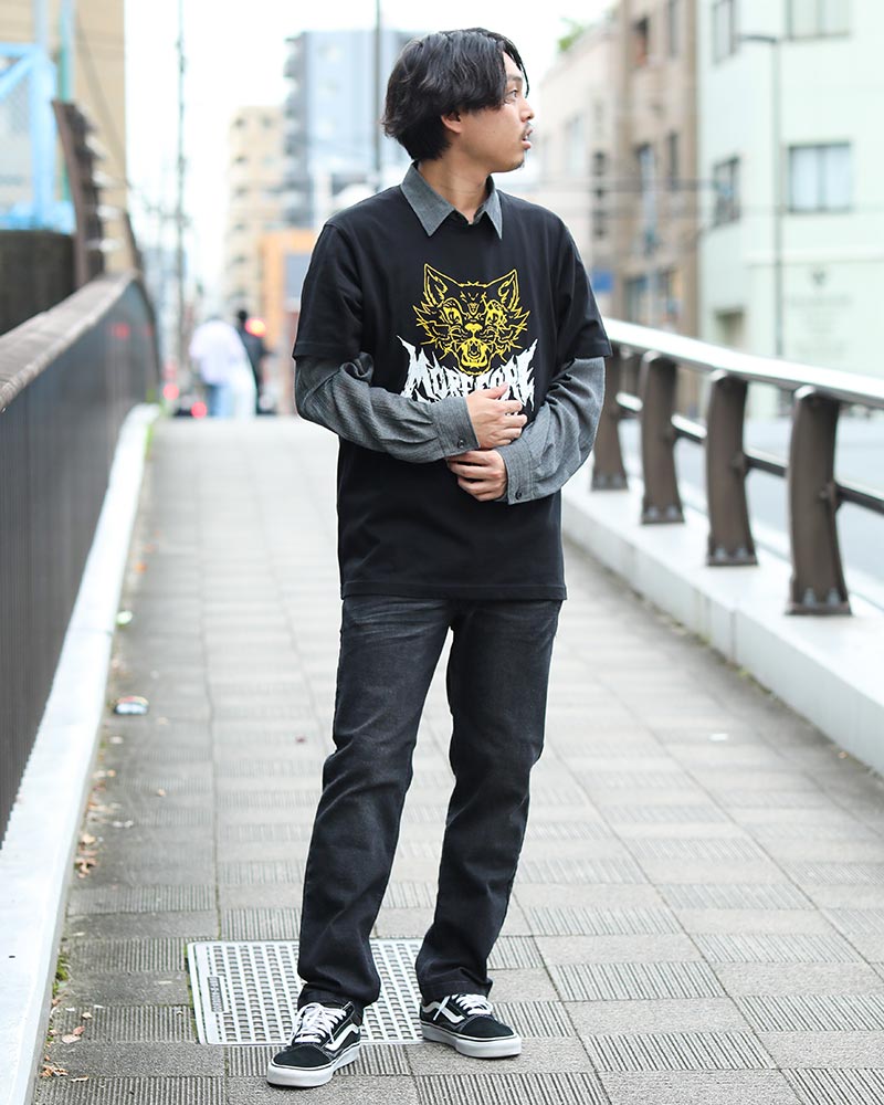 ロックバンドTシャツに、シャツをレイヤードさせた 甘辛MIXスタイル。 シャツは羽織るのではなくインナーとして着て、 周りと差をつけた着こなしに。 イエローカラーのスケアリーキャットがアクセント! 身長173cm TOPS:L BOTTOMS:M