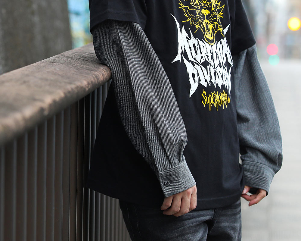 ロックバンドTシャツに、シャツをレイヤードさせた