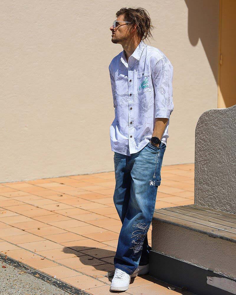 デニムパンツを合わせたカジュアルなスタイリングに! カジュアルに着るのはもちろん、 旅行先の海やプールなどのアウトドアシーンで羽織るのも◎