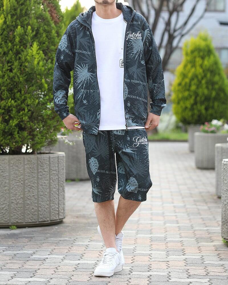 ご近所のちょっとしたお出かけには、着心地重視で快適に過ごせるセットアップが◎ 見た目も着心地も爽やかなリーフ柄セットアップで、優れた吸水速乾性と通気性をもち、 湿度の高い日本の夏でもドライで爽やかな着心地をキープします。