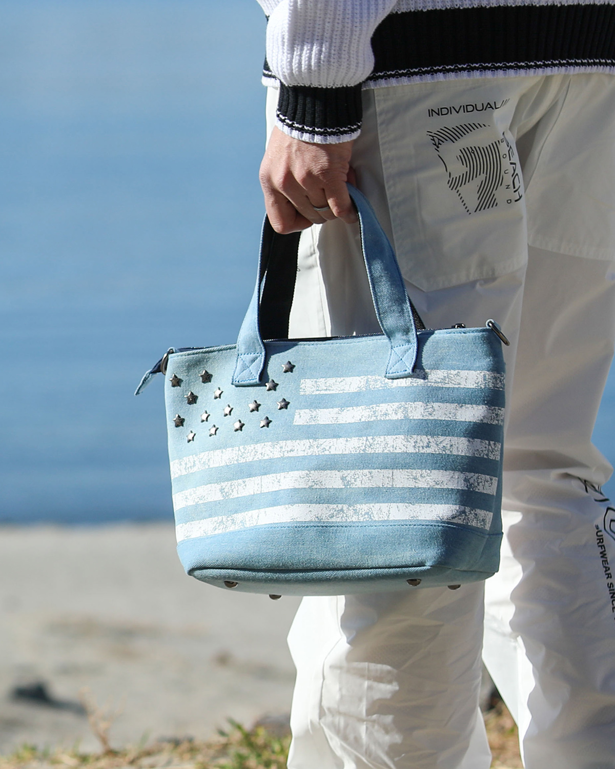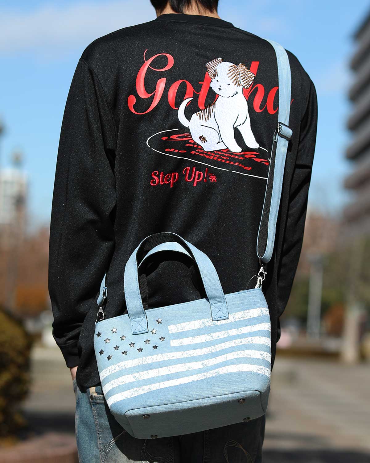 BUY↳アメリカ国旗の星条旗をモチーフをデニムトートに落とし込みました。スタッズは星型に。