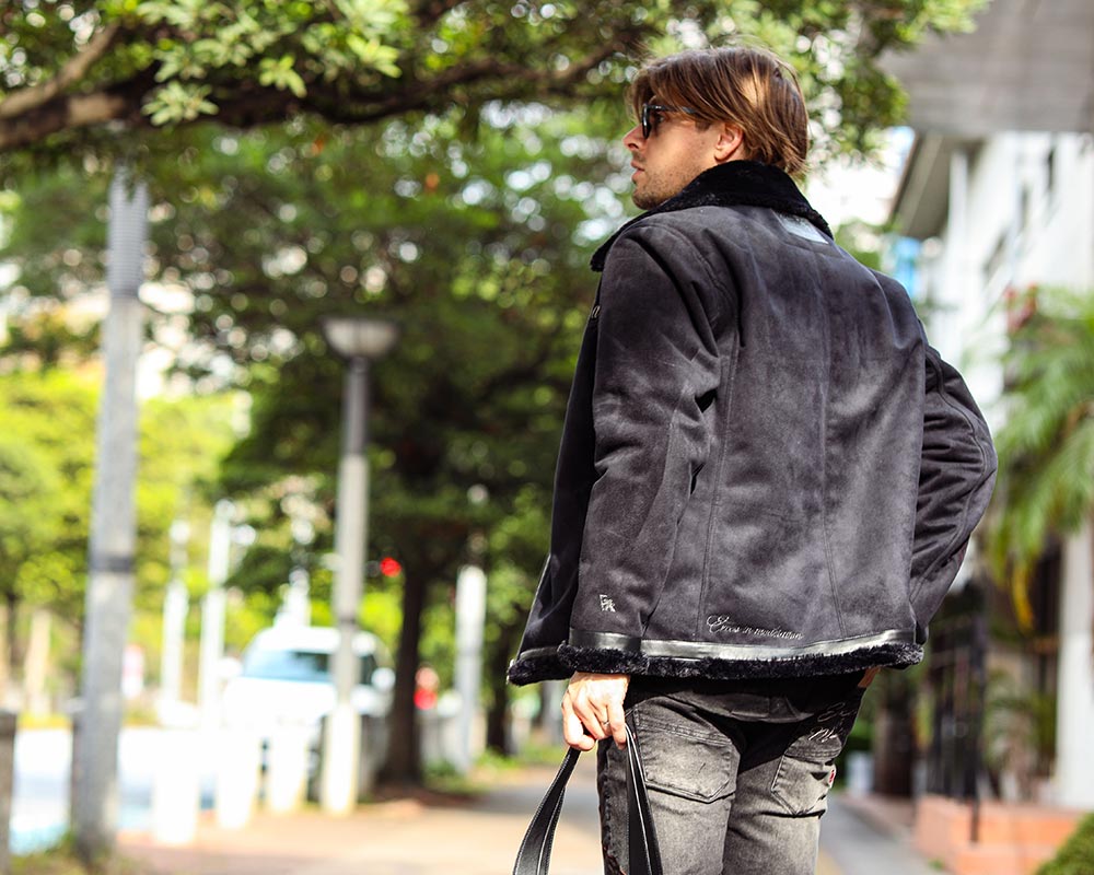 滑らかなタッチと上品な光沢感が魅力のフェイクムートンジャケット。