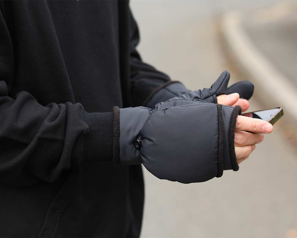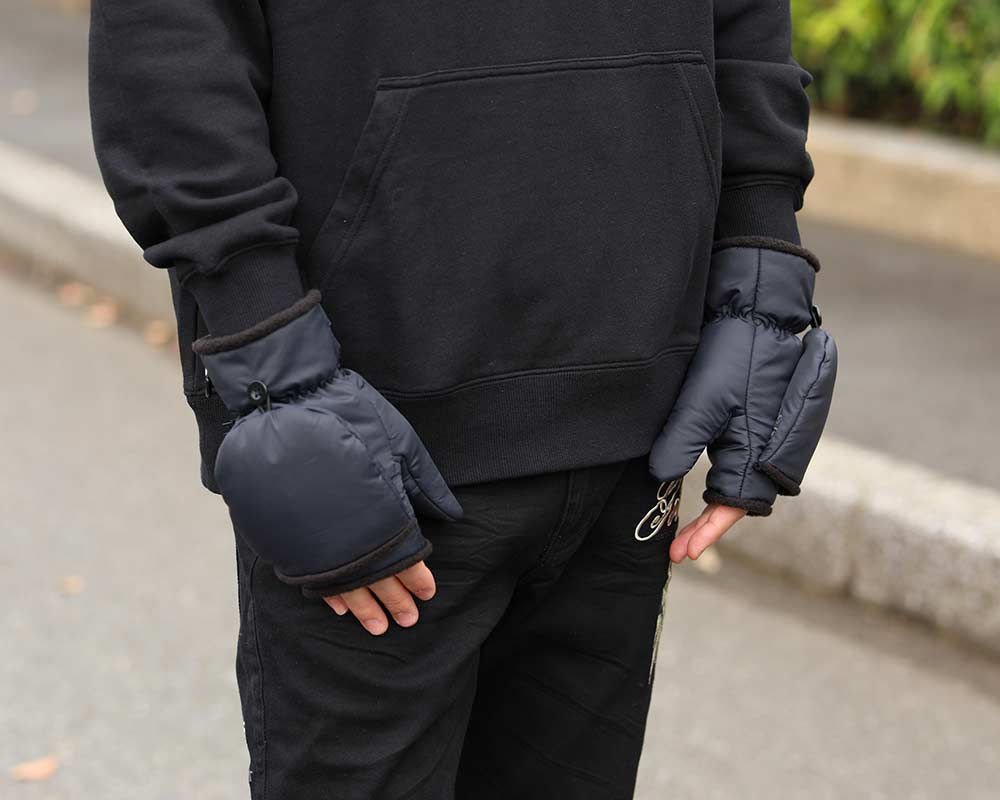外したカバーをボタンで留めれば指切り手袋として使える2way仕様がポイント。