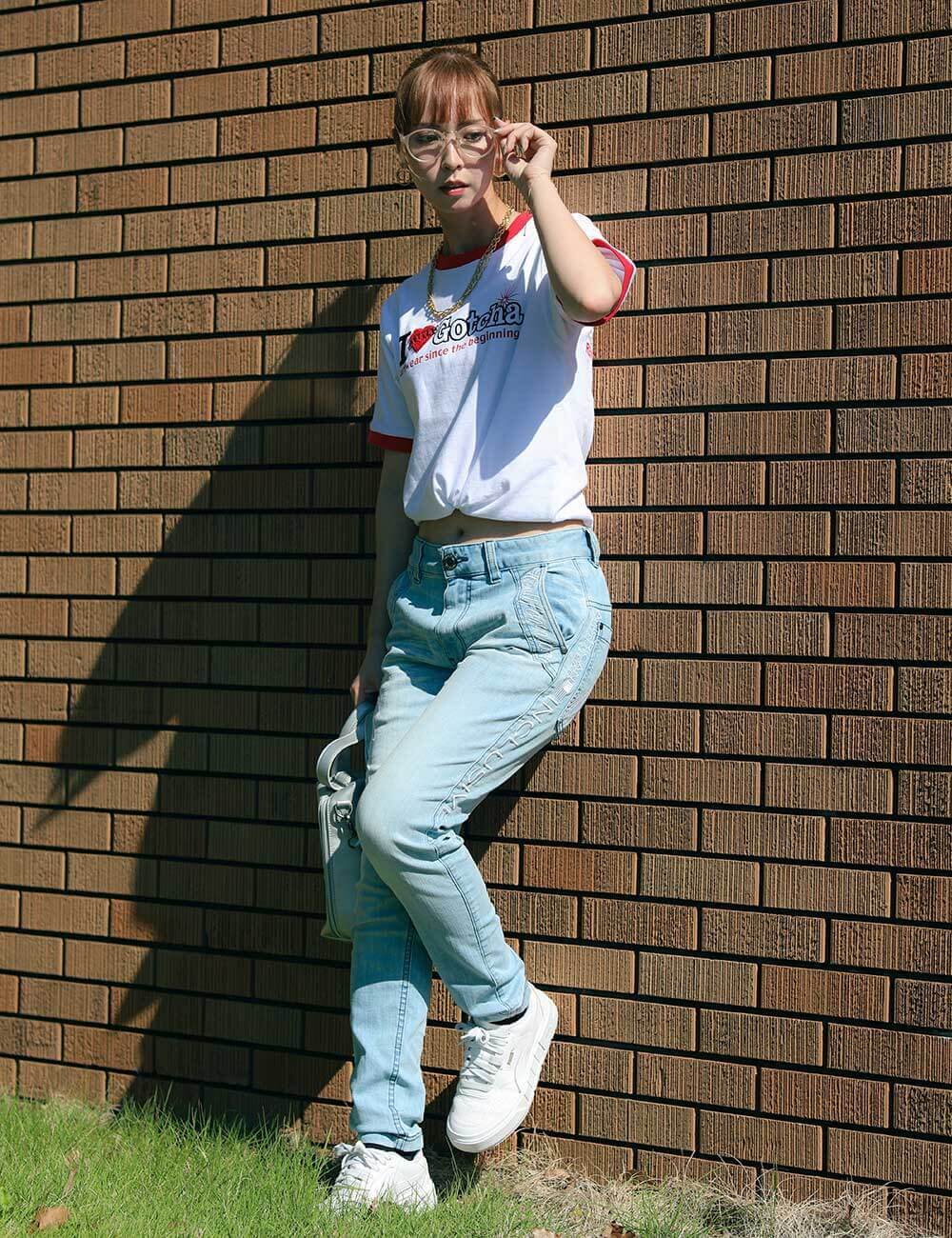 I ♥ GOTCHA. ハートがサガラ刺繍に!つい触りたくなる可愛さでふわふわ感が女性らしい1枚。 ベーシックなブリーチデニムを合わせ、爽やかさと可愛らしさをバランスよくMIX。 Tシャツは、フロント裾を結んでショート丈風にして女性らしい着こなしに。