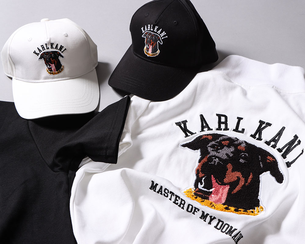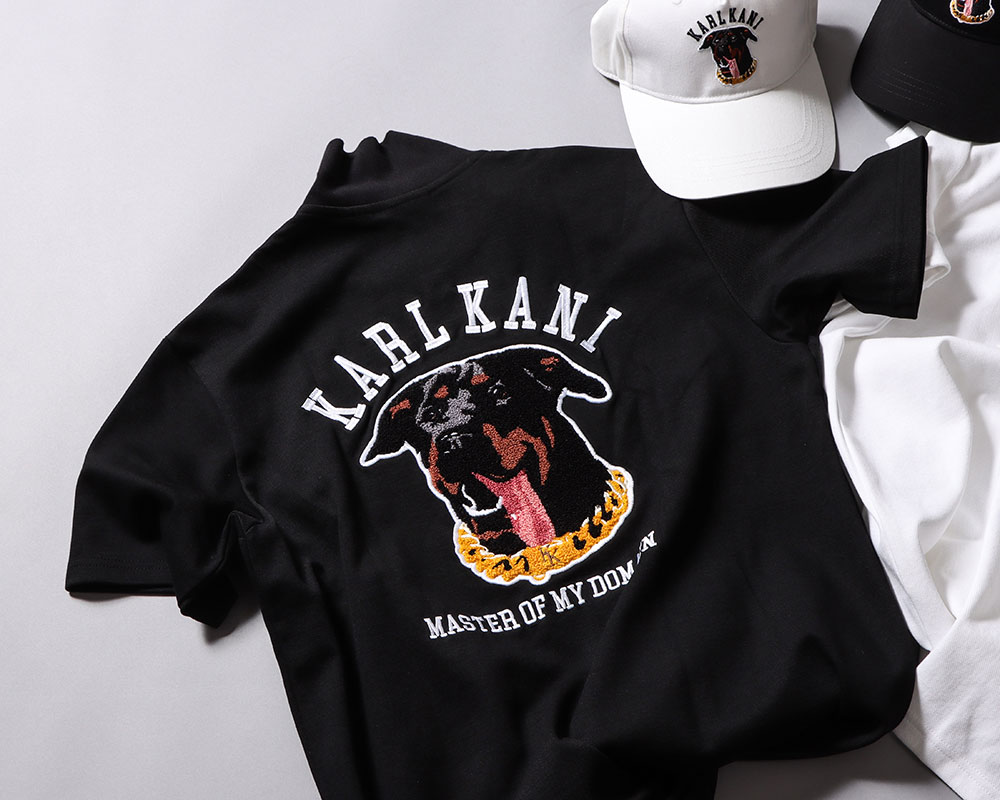 ドッグ ポロシャツ ¥9,990(TAX IN) KANIのチェーン首輪を付け、いかつい見た目をしたドーベルマンをバックにON。 ドーベルマンは、立体感のあるサガラ刺繍にすることで可愛らしくも大人な雰囲気に。 サイズ感は標準なので、カジュアルに着たい場合はワンサイズUPで着用するのがオススメ。