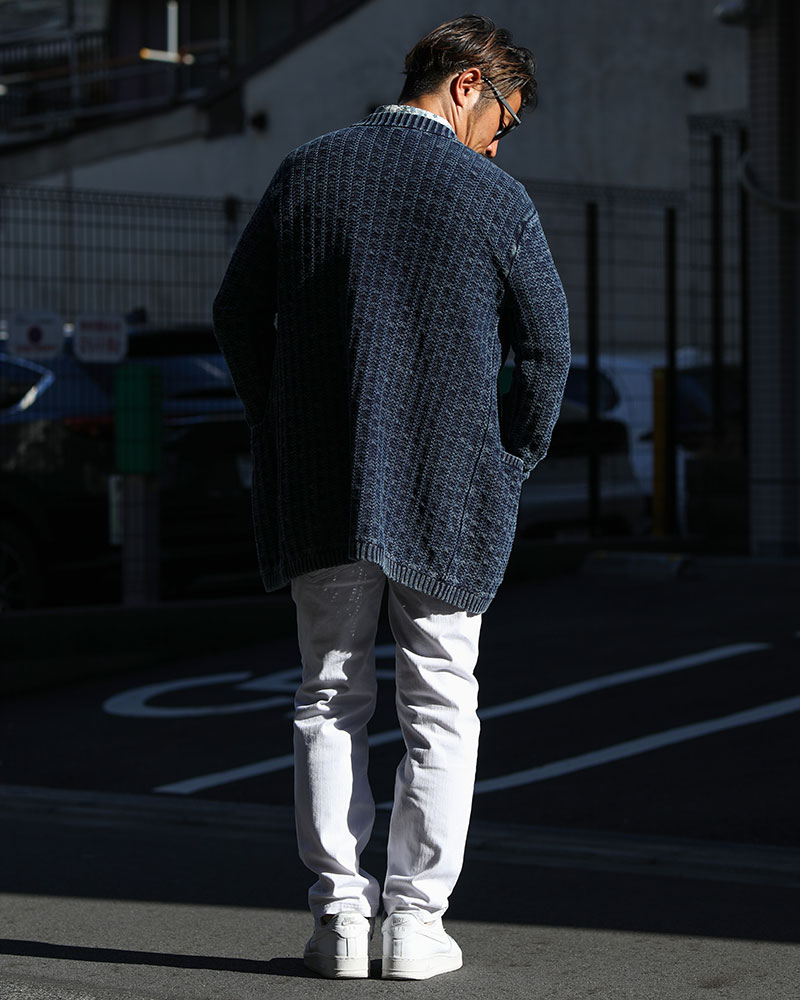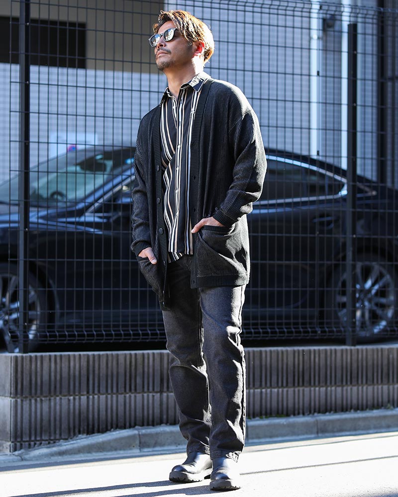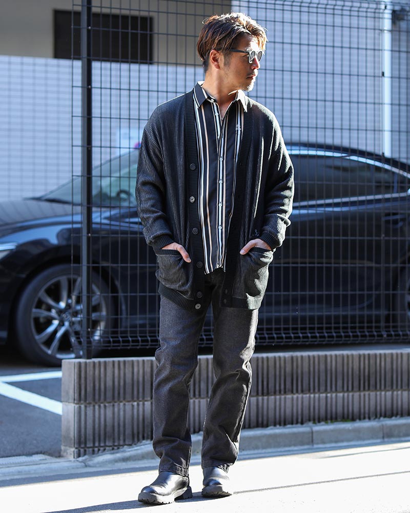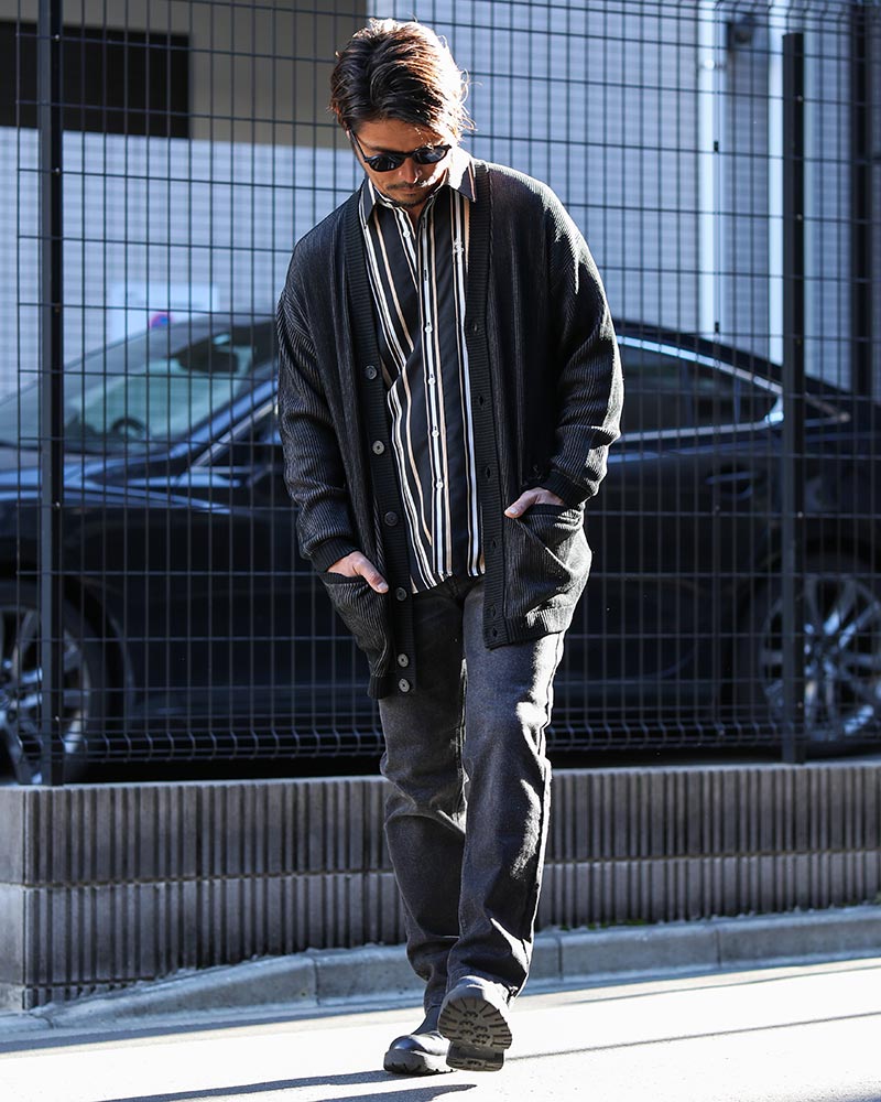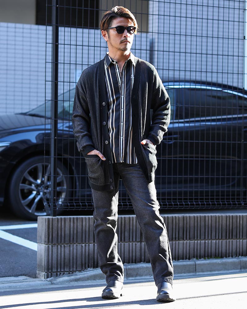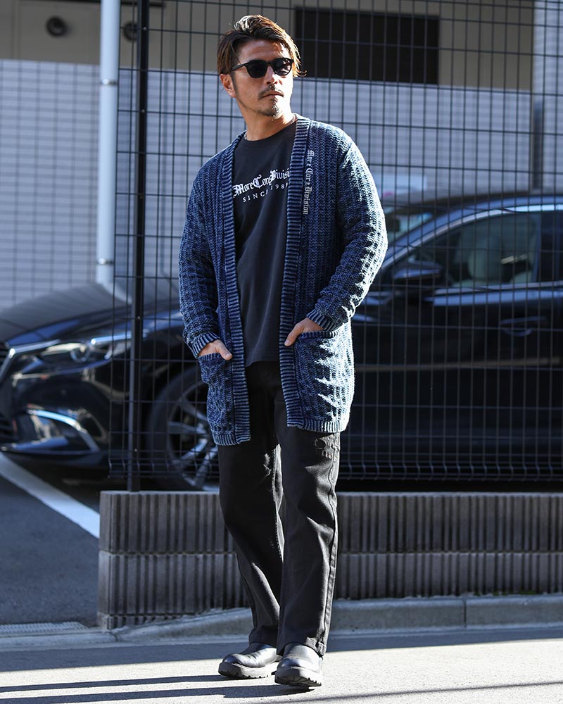 インナー・ボトムスはブラックで統一し、インディゴカーデを主役にしたスタイリング。