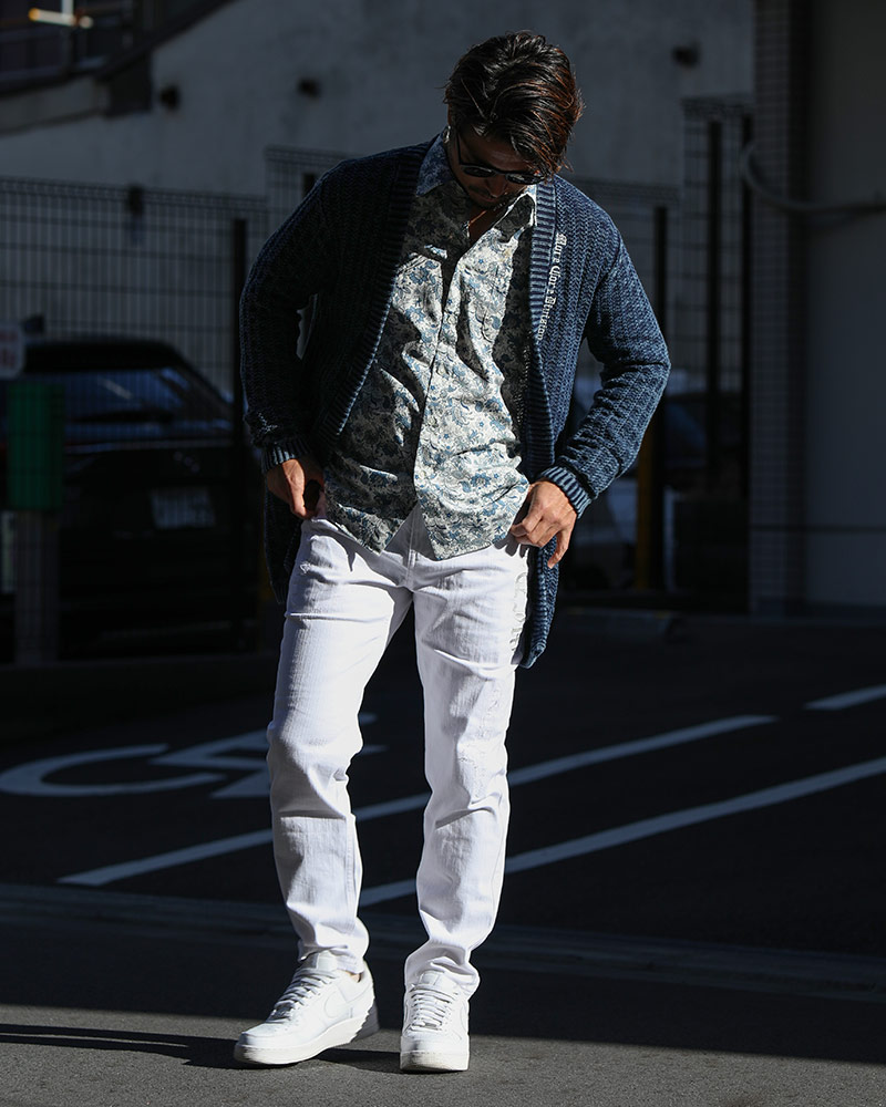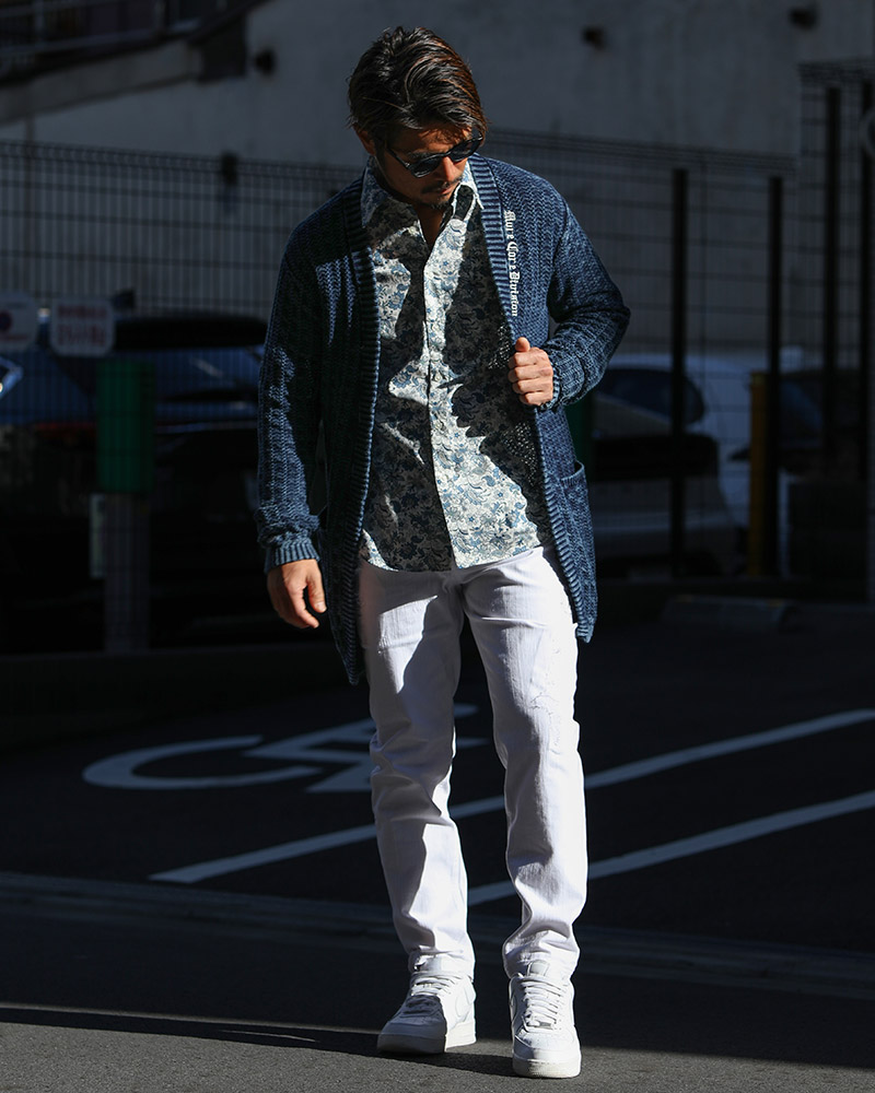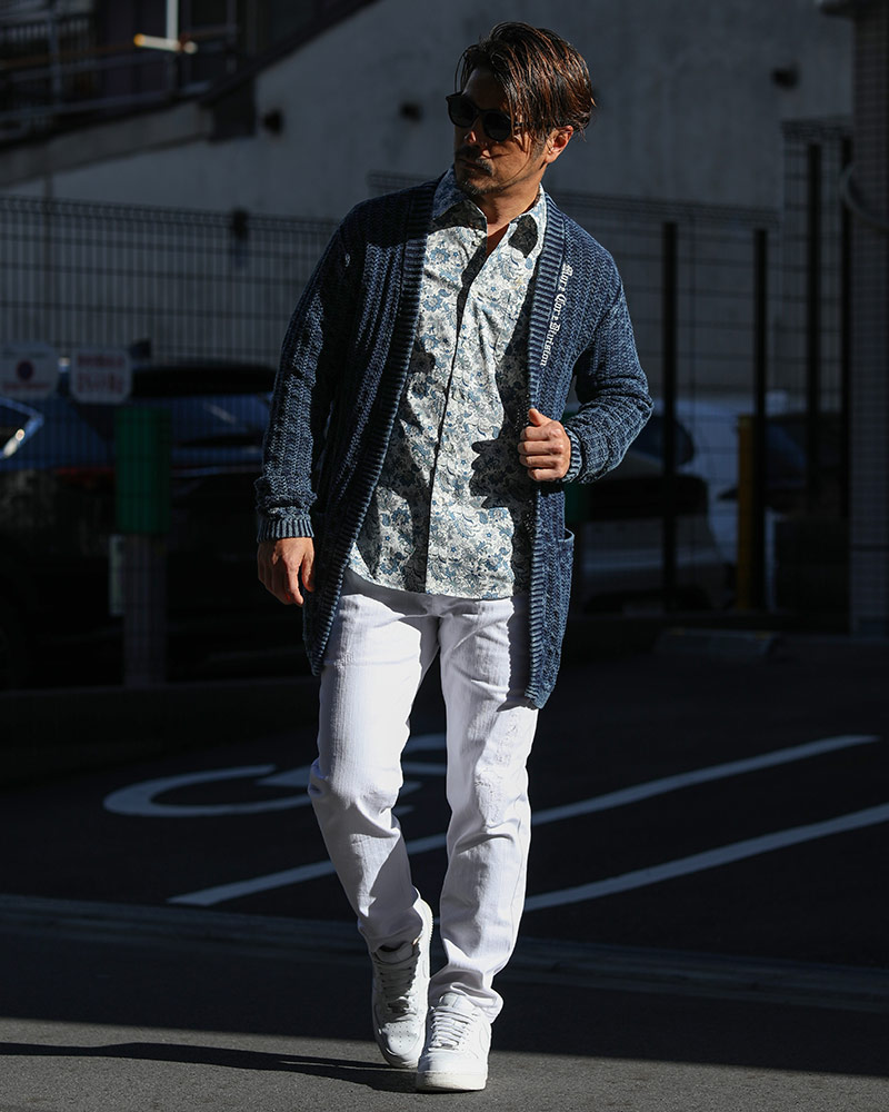 インディゴカーデ×ホワイトボトムスで、一気に春らしさを加速! インナーは、ブルーのペイズリー柄シャツを仕込んで爽やかさと大人っぽさを兼ね備えたコーデに。