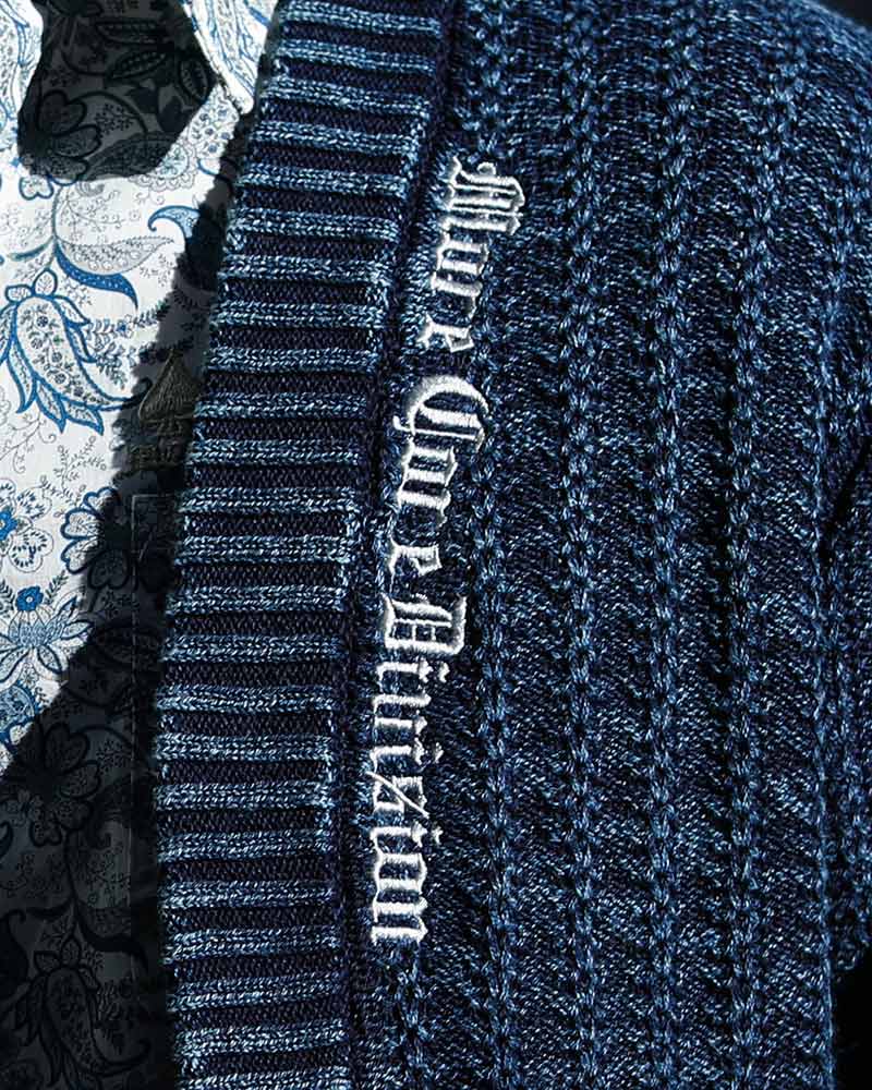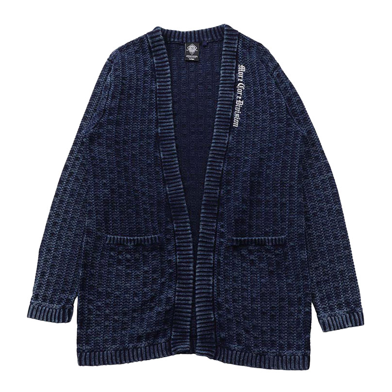 インディゴ染めのデニム風ニットカーティガン。
