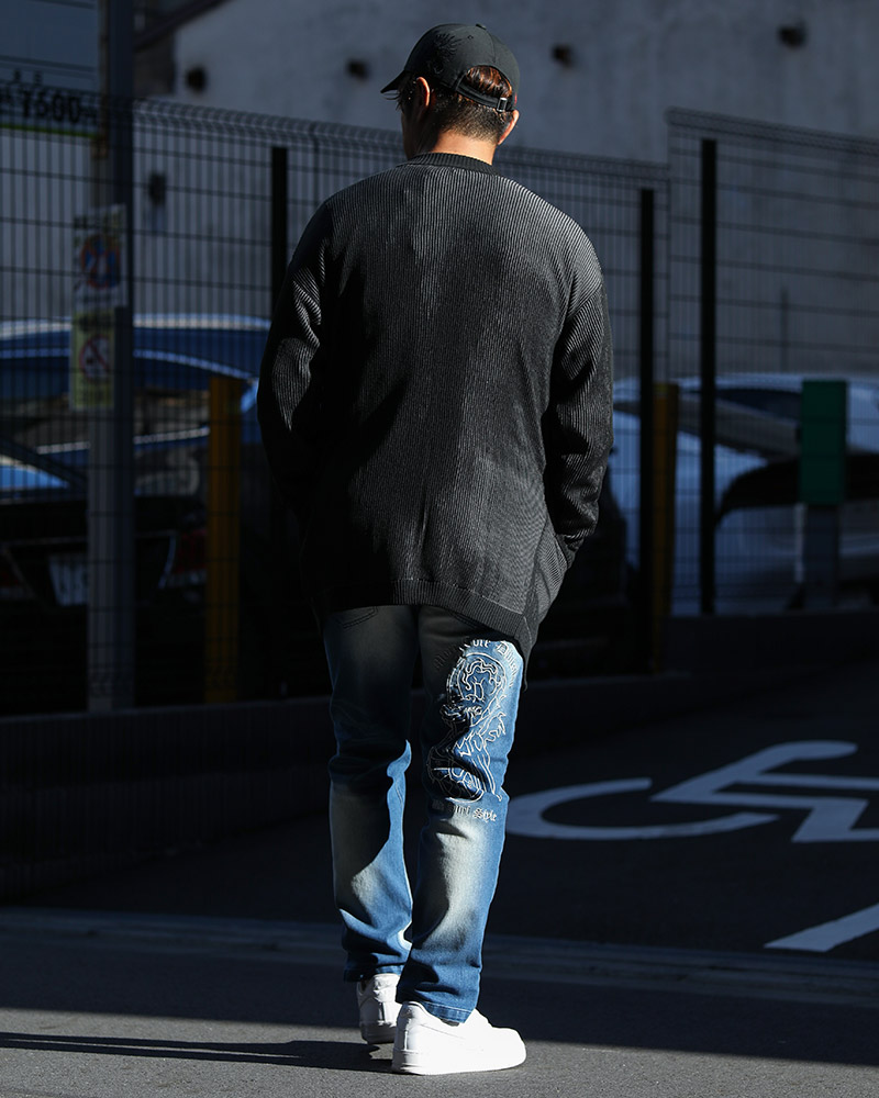 インナー・ボトムスはブラックで統一し、インディゴカーデを主役にしたスタイリング。 ボトムスはゆったりしたシルエットのバギーパンツをチョイスし、トレンドライクな着こなしに。