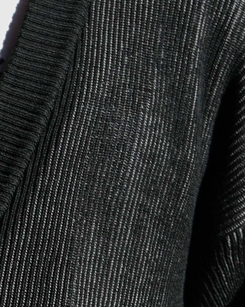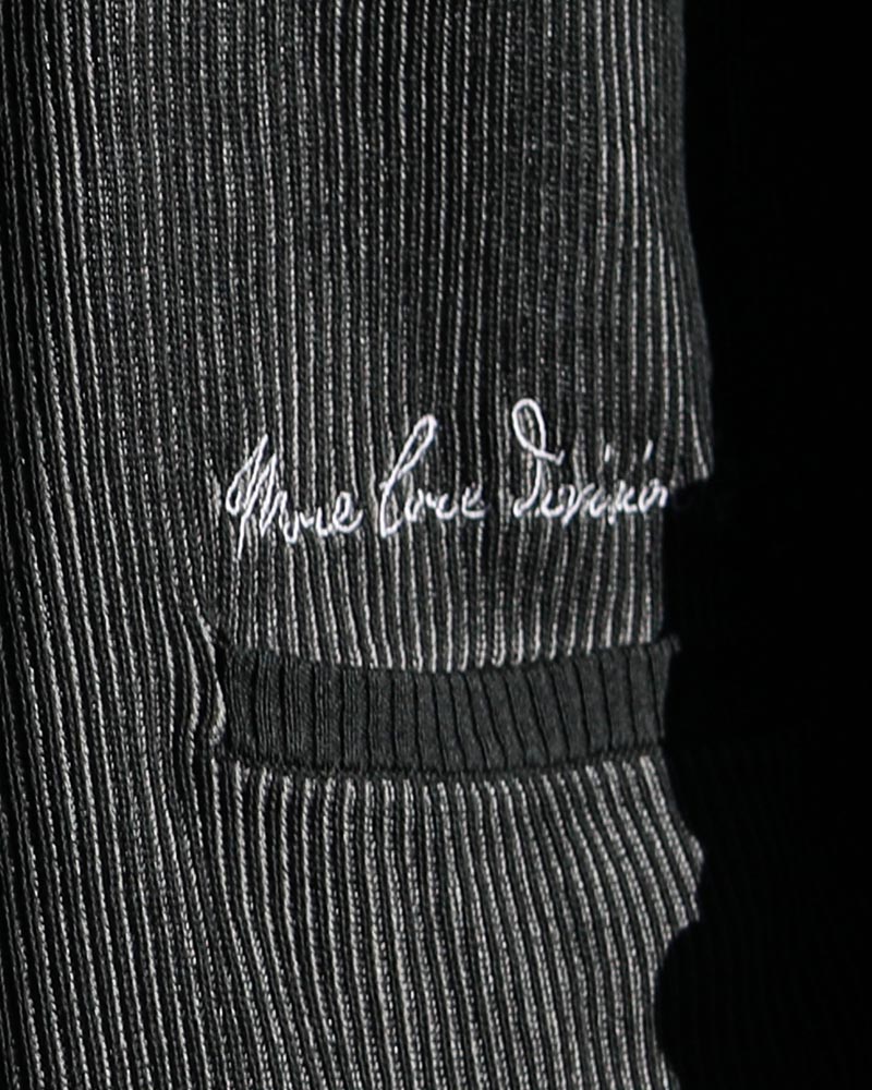 表側はブラックの糸、裏側はグレーの糸を使用し、 伸ばした部分からグレーの 色がチラ見えして シンプルなデザインながらも動きに合わせて表情が変わる1着に。 無彩色で仕上げているので、様々なアイテムとも好相性◎