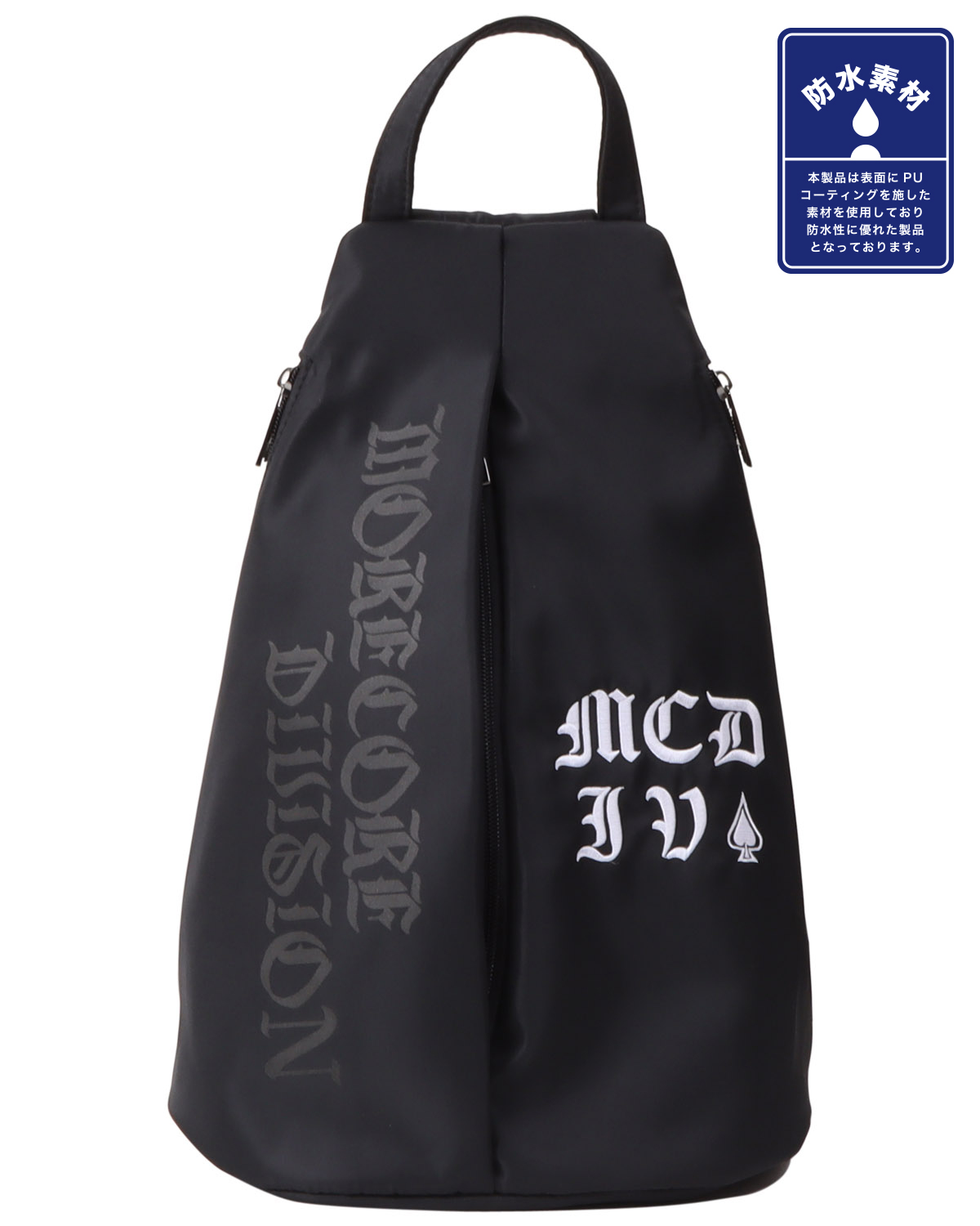 アウトドアやレジャーなど様々なシーンで活躍するボディバッグは「防水素材」を使用。サイズ感も程よく重宝するのと、ボディバッグとしては珍しい自立タイプ。