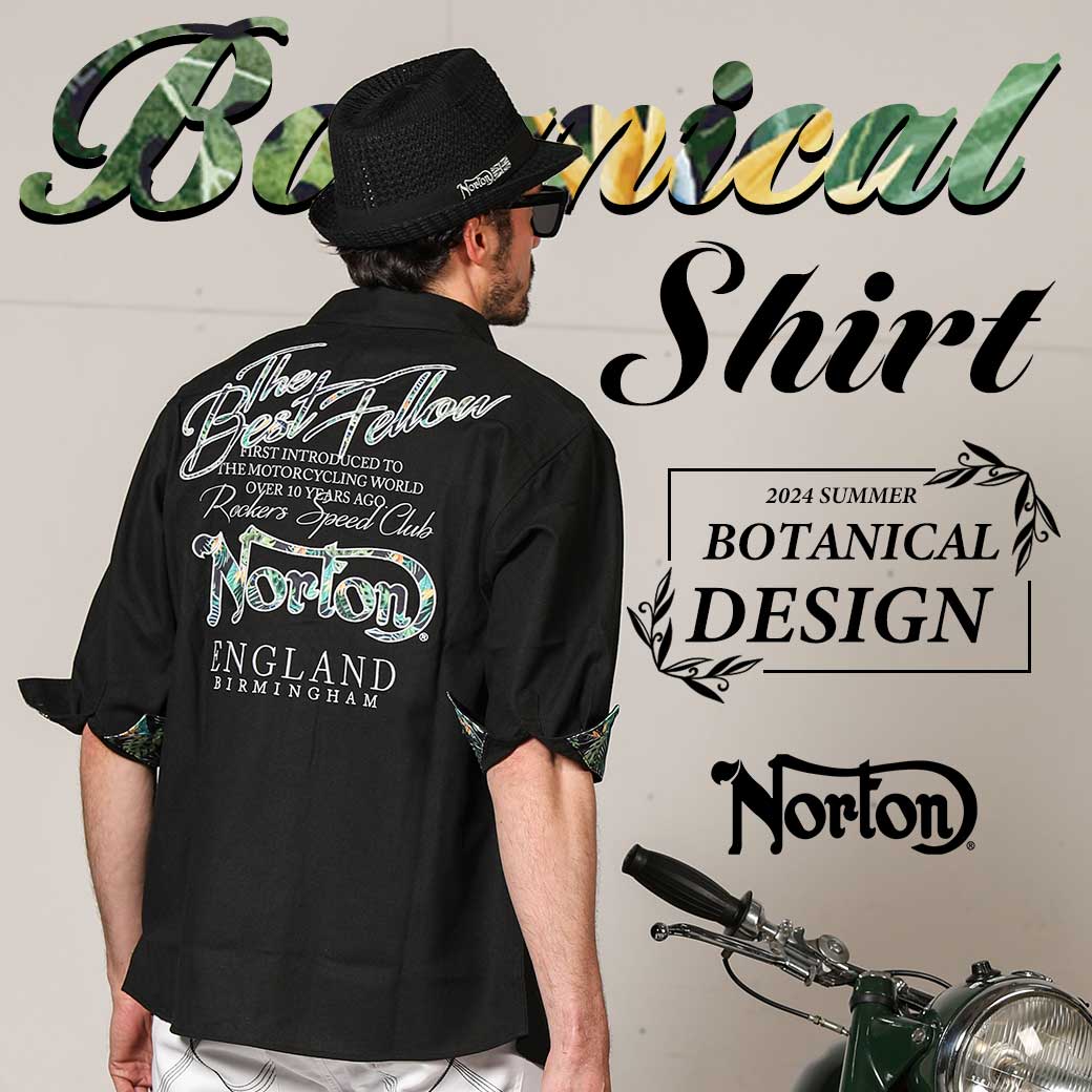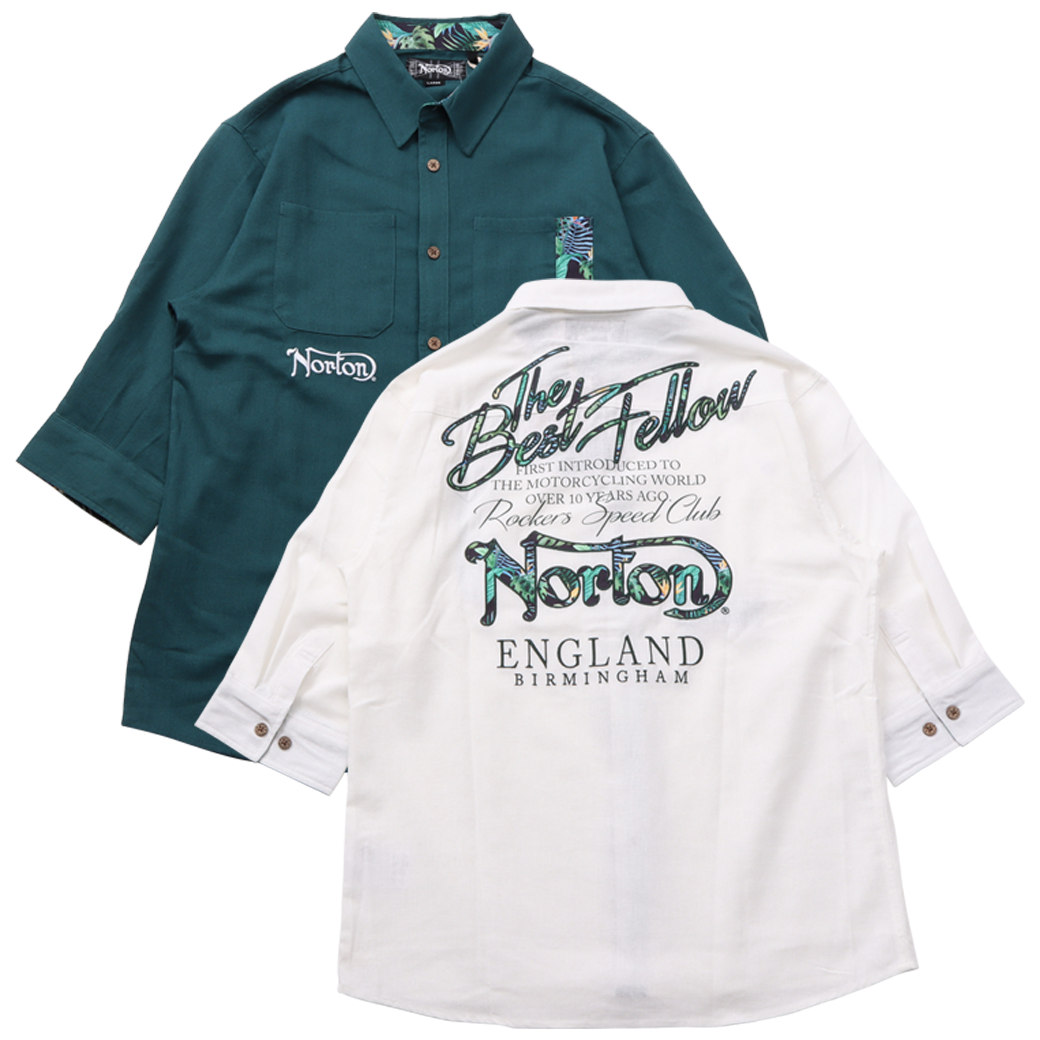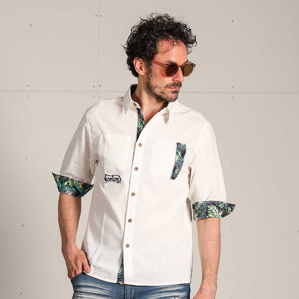 [Norton]ボタニカル 柄使い麻混 6分袖 シャツ