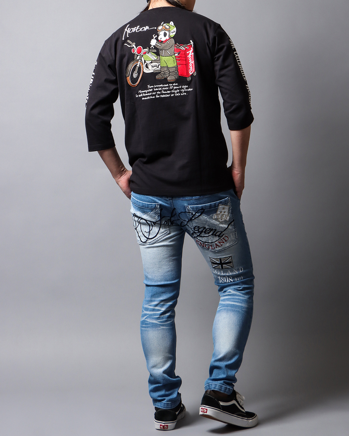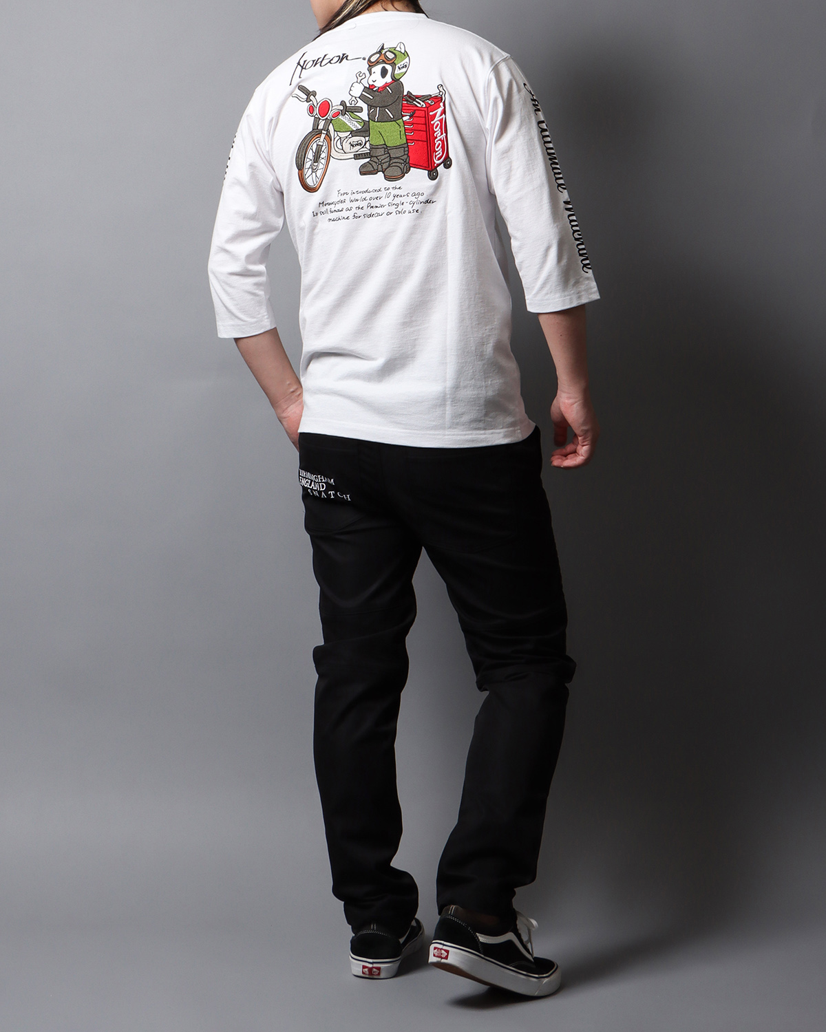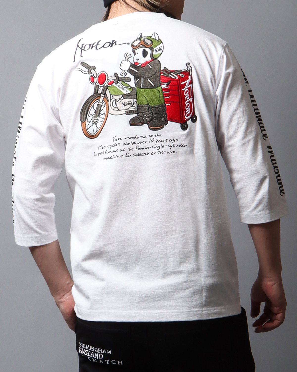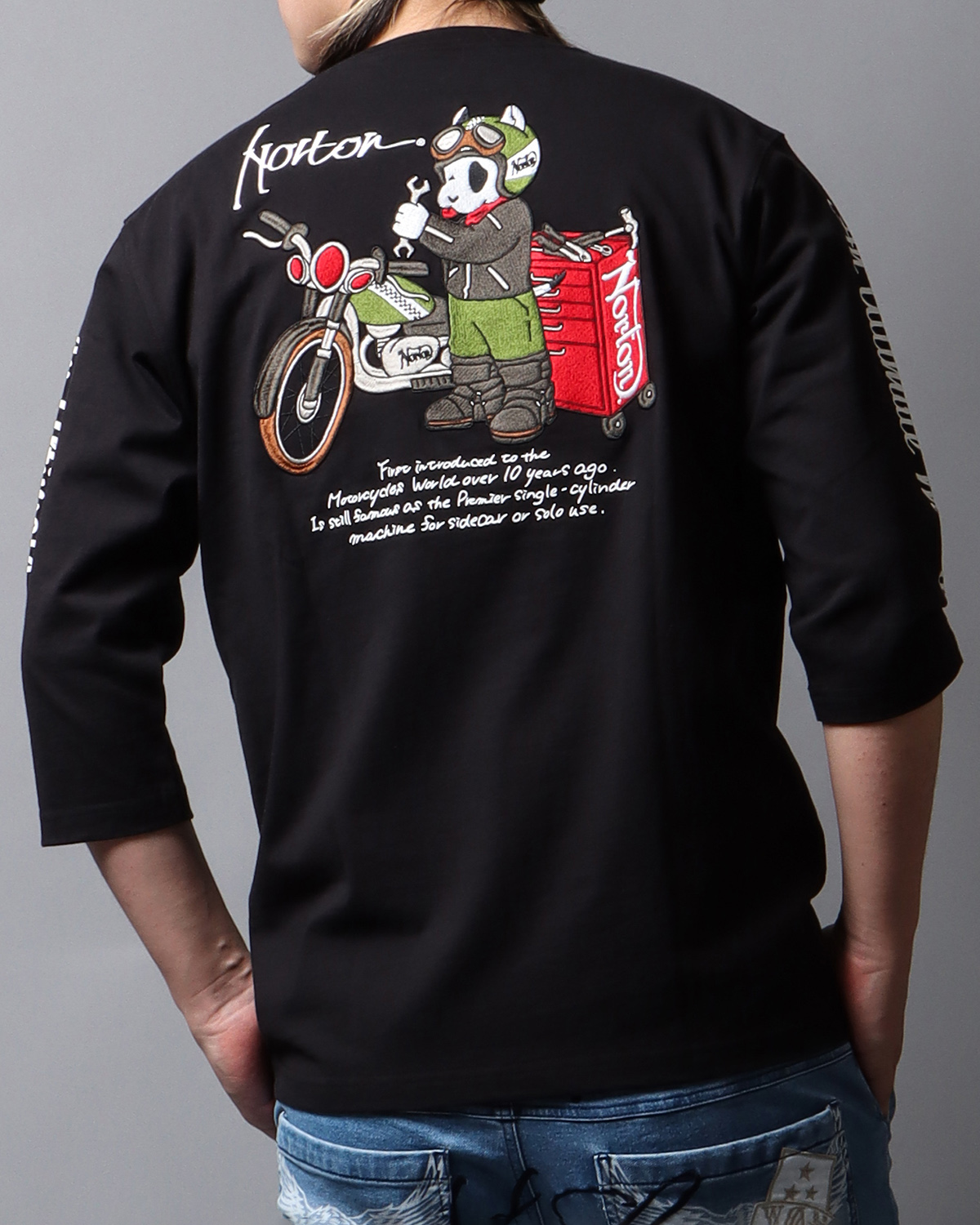乗っていたバイクのメンテナンスをするドッグライダー"ジェームス"。メンテナンスBOXから細かい工具まで全部刺繍で仕上げた1枚に。