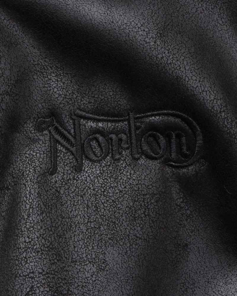ハードなルックスと重厚感が魅力的なフェイクムートンジャケット。ひび割れしたようなヴィンテージ風加工が入っているところに注目。