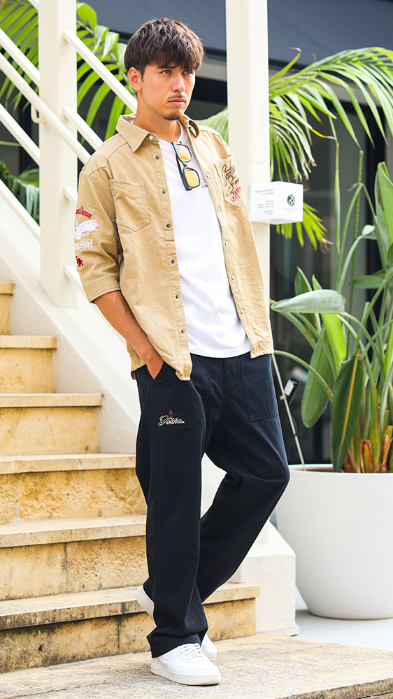 秋カラーかつ注目のベージュ。ゆるっとしたシルエットの褪せ感のあるブラックパンツとの合わせが◎。特にこのパンツはイーグルと相性の良い柄を配置しているので間違いなし。インナーは羽織物を主体にしているので、ワンポイントTがベスト。